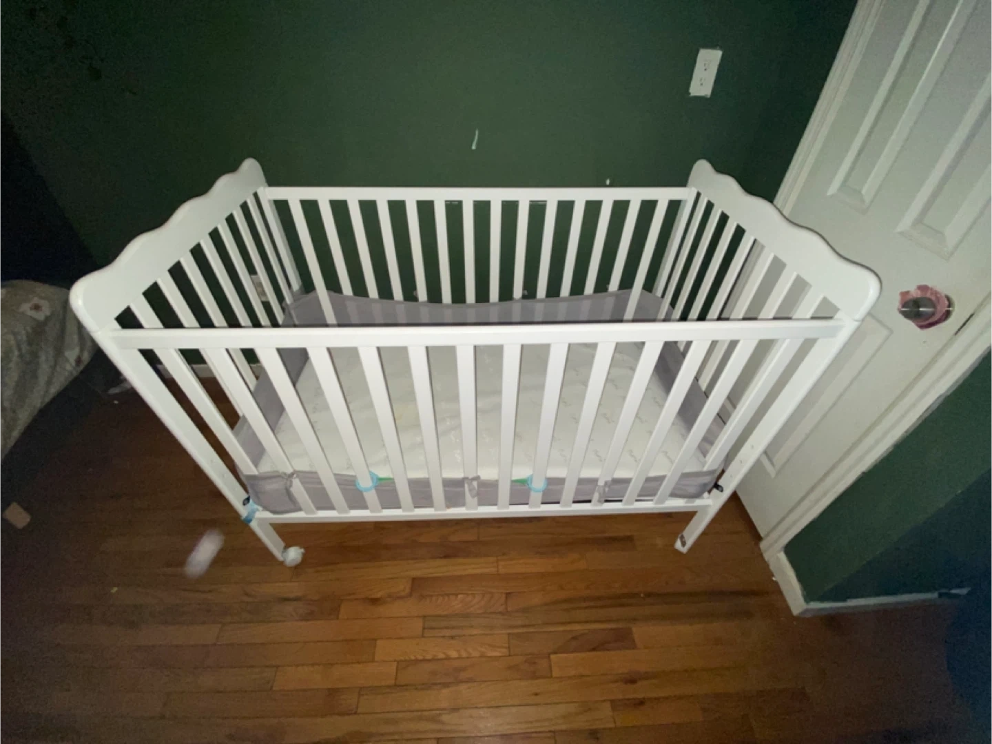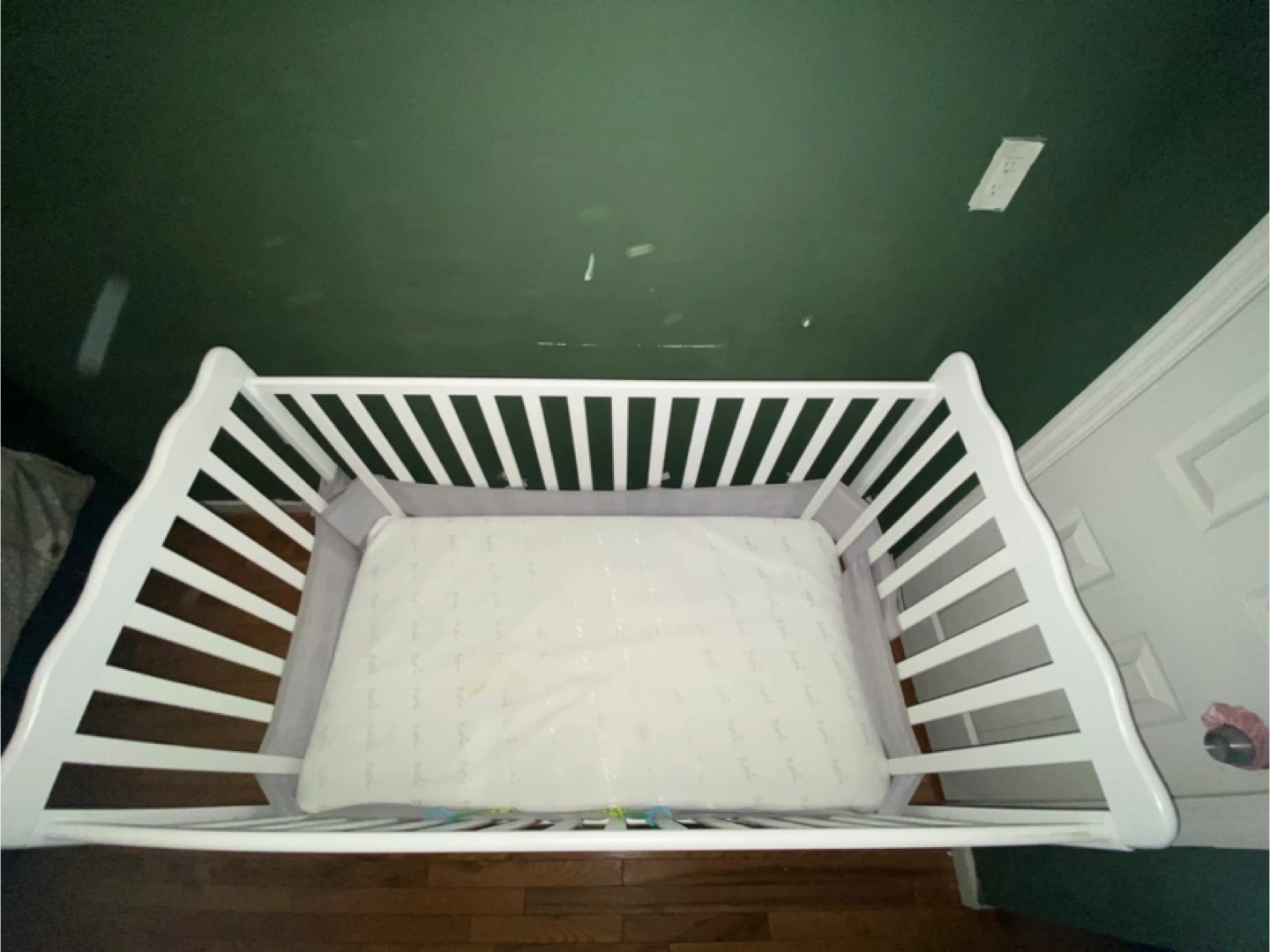 Selling a white baby crib in good condition! It's sturdy and perfect for a nursery. The crib is ready for a new home and will provide a safe and comfortable space for your little one
