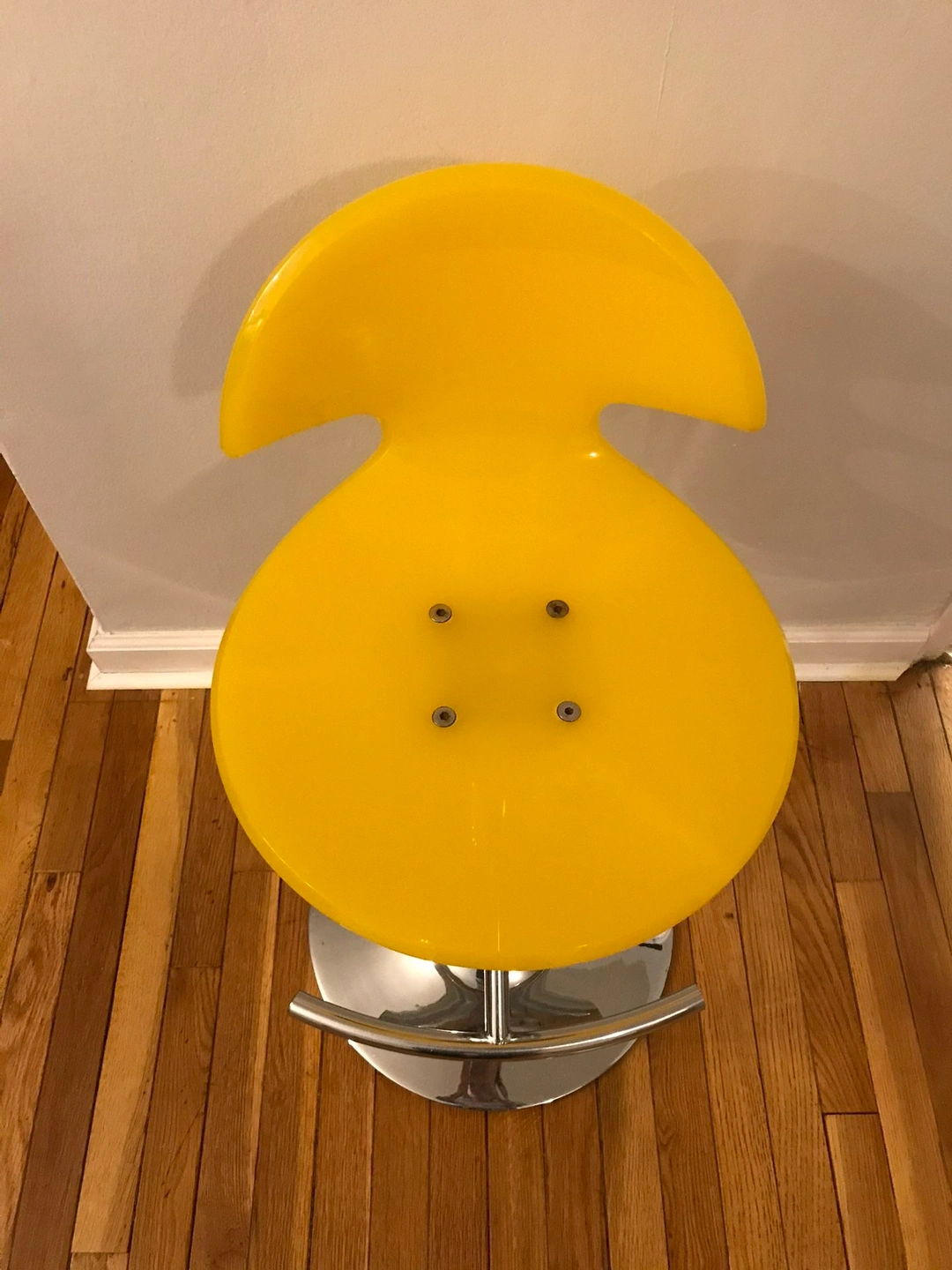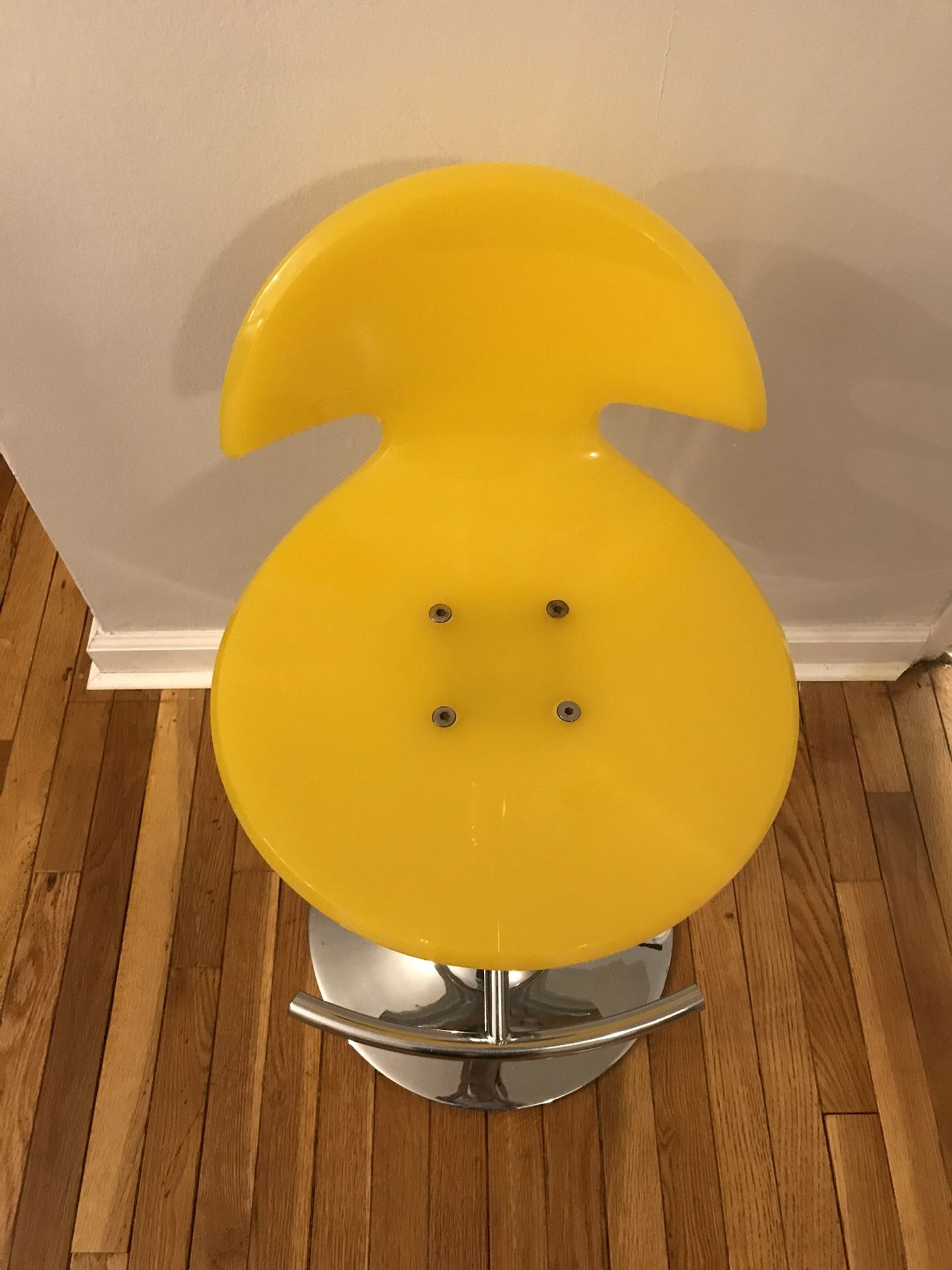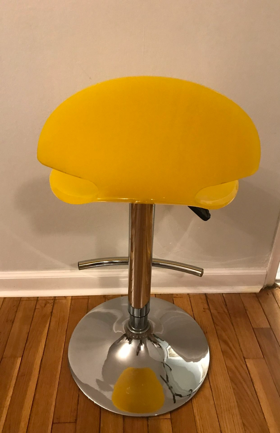 Adjustable seat height. Sleek chrome base with footrest. Bold yellow seat with a contemporary curved design. Sturdy and comfortable — perfect for kitchen counters, bars, or workspaces. Gently used, in great condition.