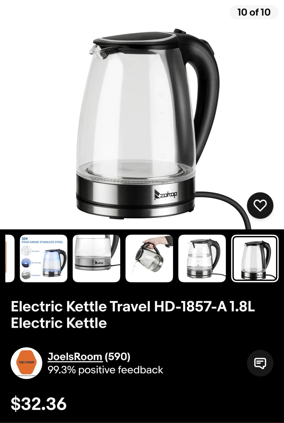 I'm selling a ZOKOP 1800W/1.8L Electric Glass Kettle. It has a US Plug and LED light. It also has auto 5 minutes shut-off, boil dry, and overheat protection. It is also BPA-Free, for coffee, tea, soup, and more! It has a high borosilicate glass pot body and a 304d stainless steel heating chassis. It has one-key heating, simple and quick operation. Originally bought for $49.99.