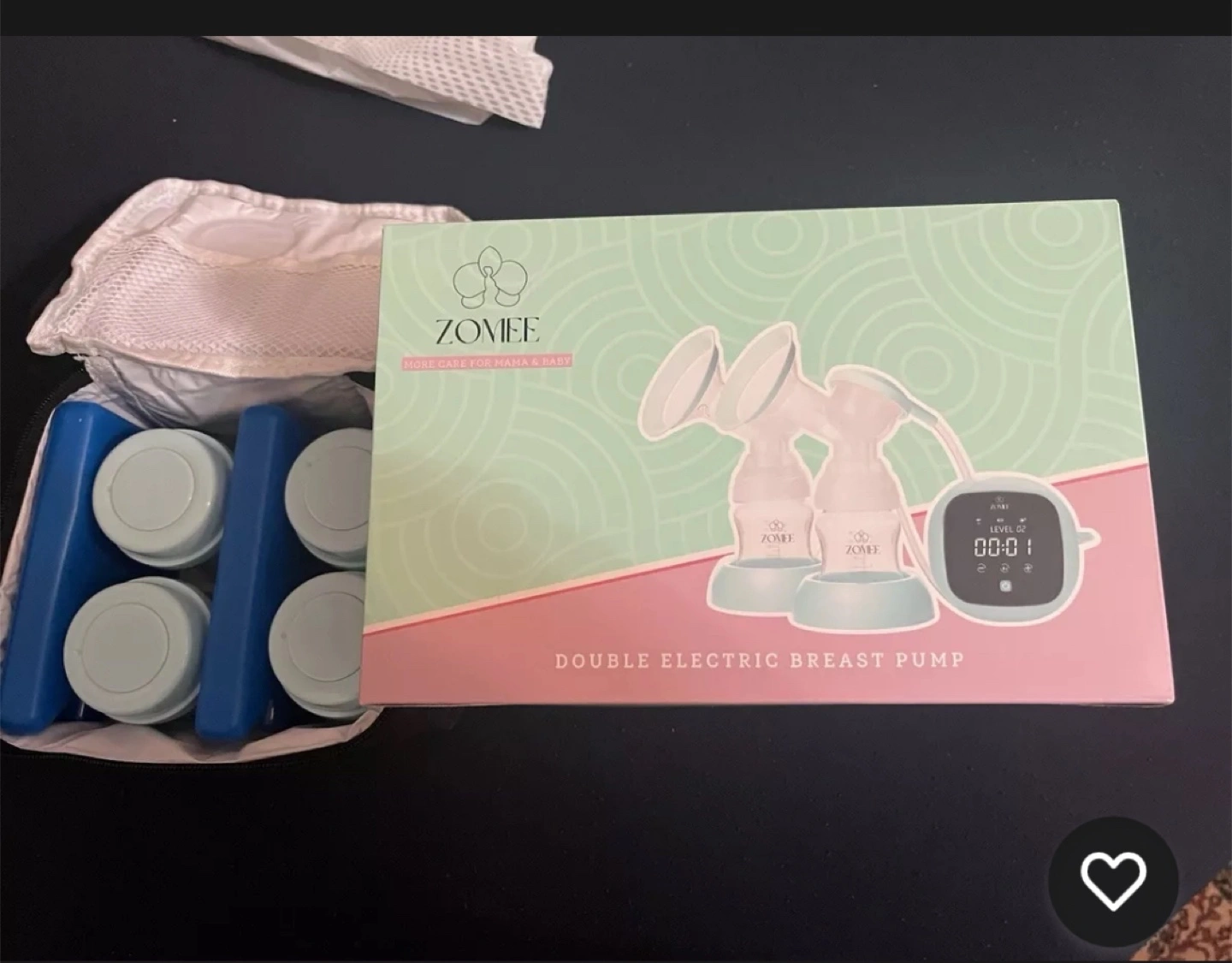 New Zomiee double electric breast pump. Includes carrying case, bottles, and ice packs. Also included are 200 Abea pre-sterilized breastmilk storage bags.