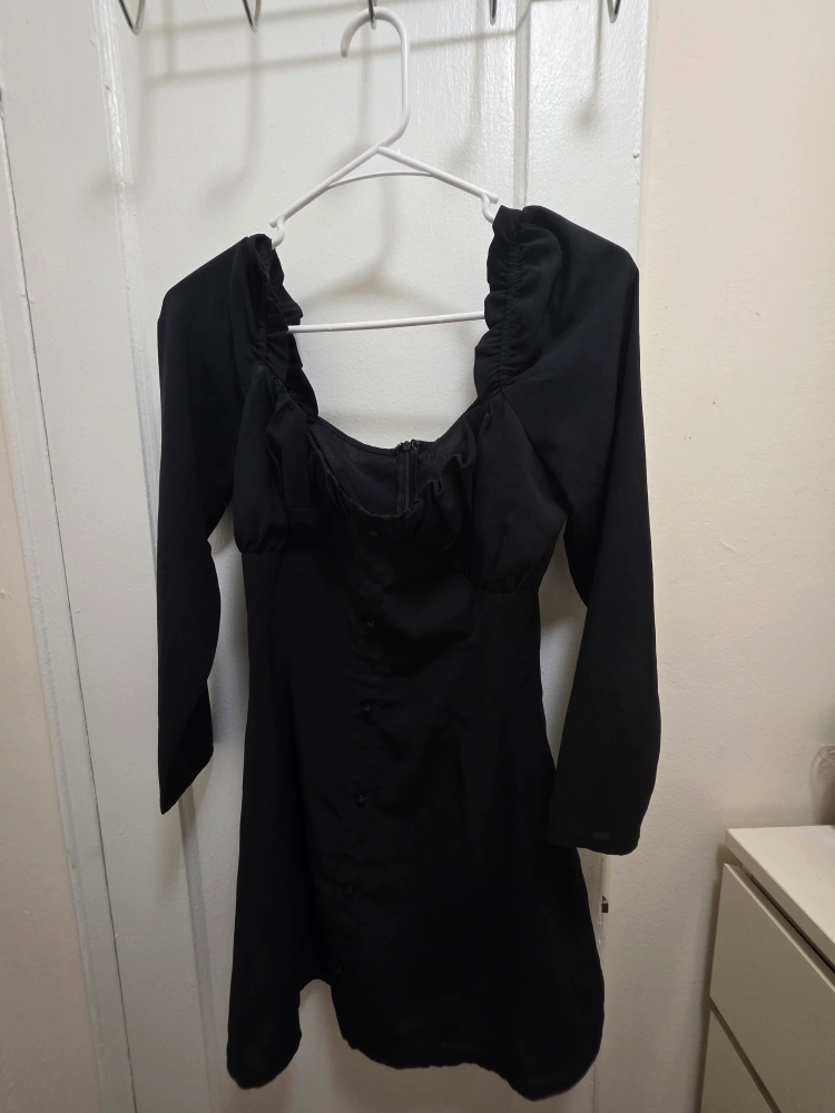Here's a cute black long sleeve mini dress! It has a flattering silhouette and is perfect for a night out or a special occasion. It's in great condition and ready for a new home