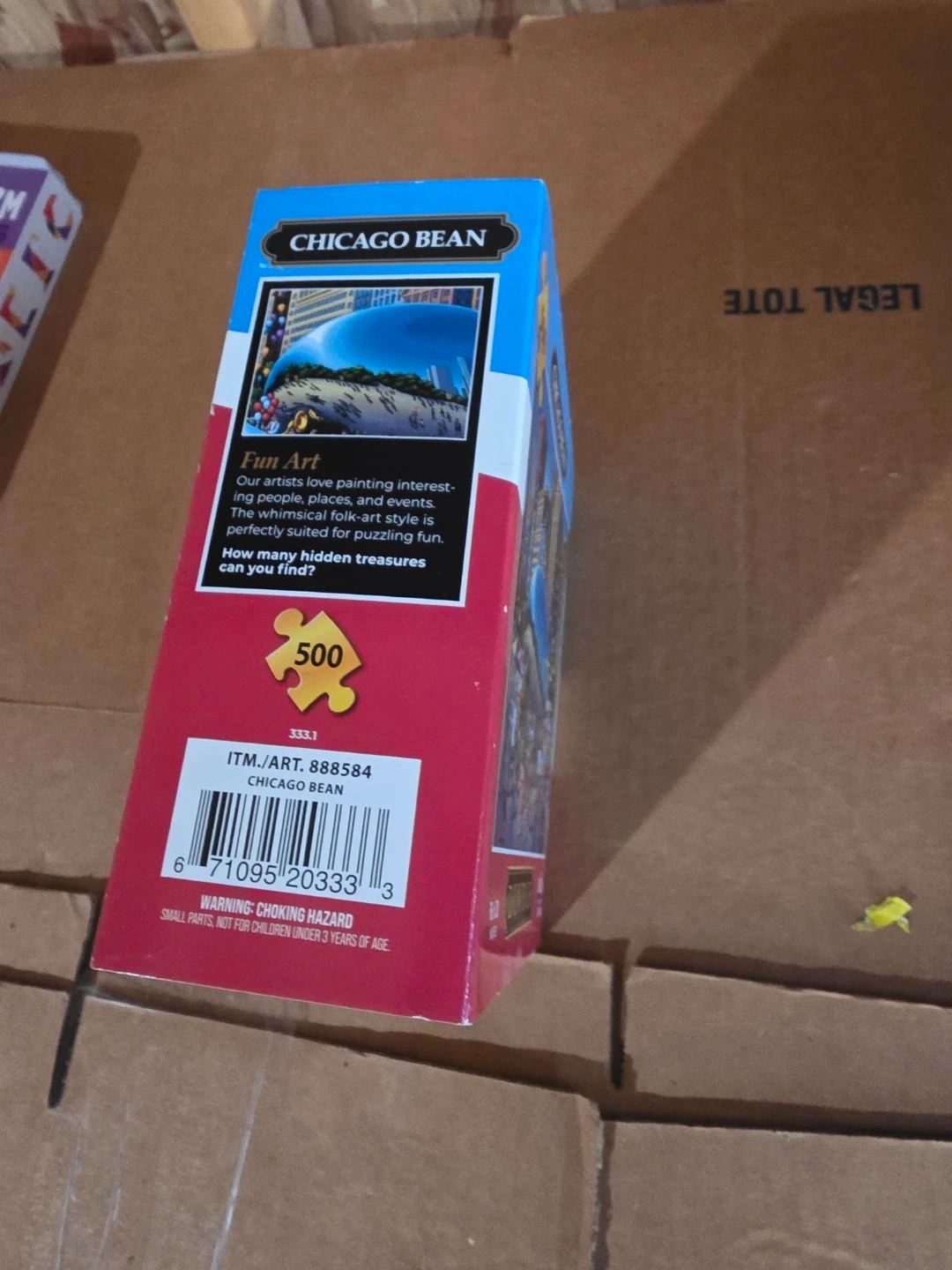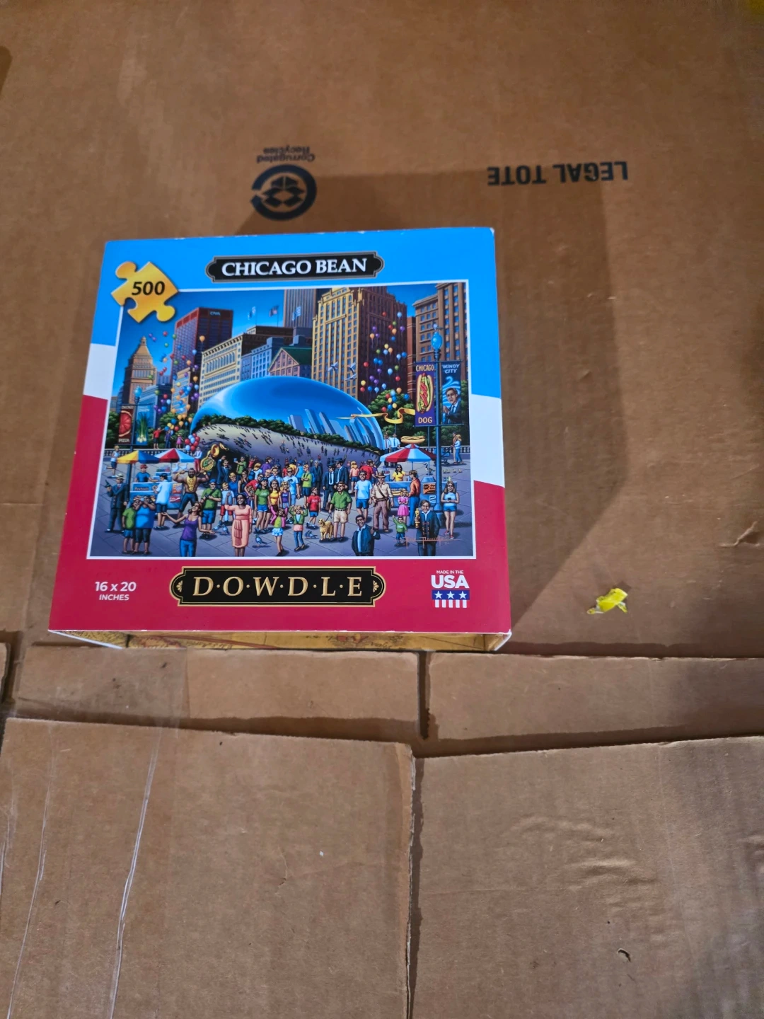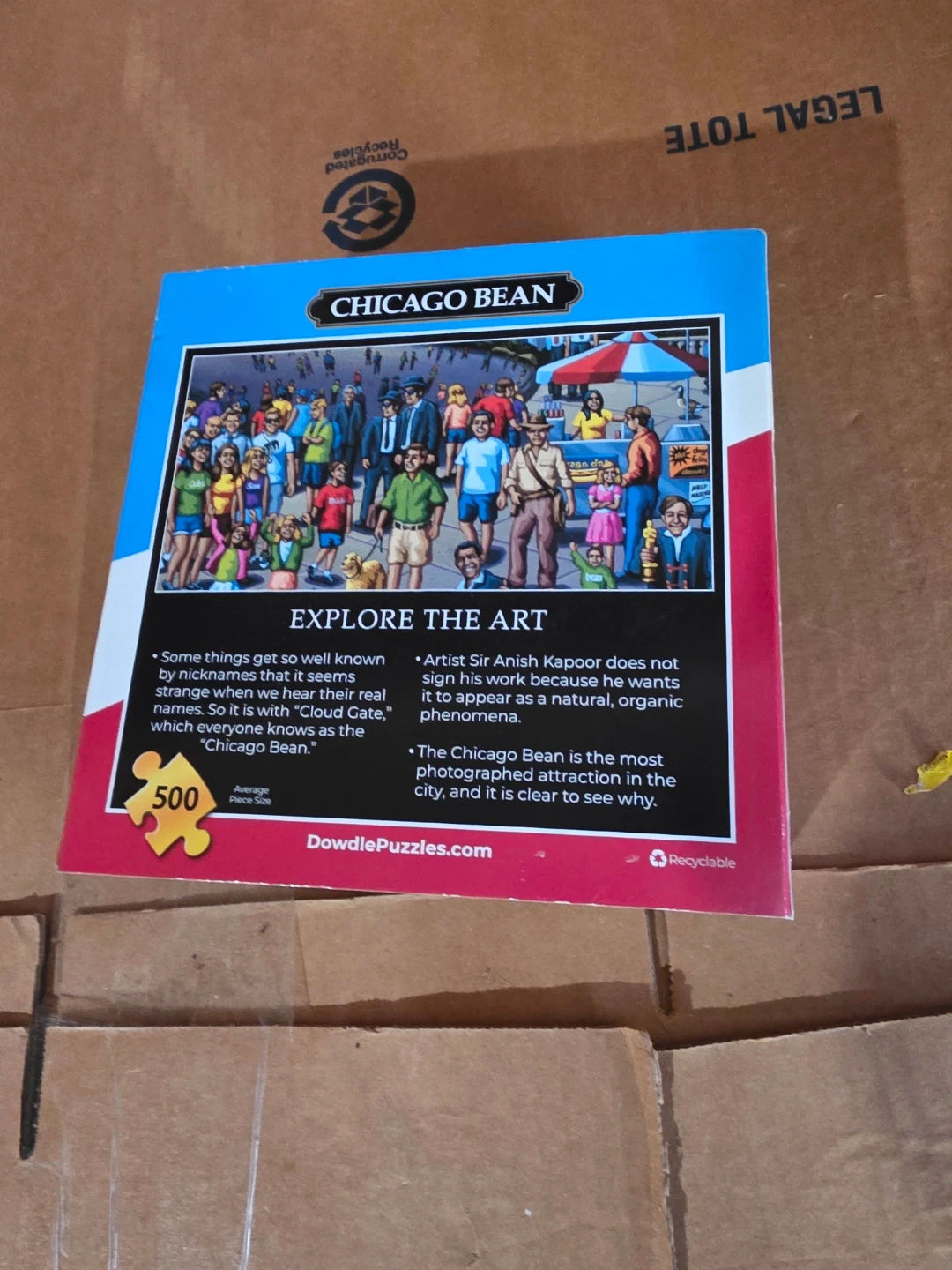 Selling a Dowdle Puzzles 'Chicago Bean' jigsaw puzzle. It contains 500 pieces and features the iconic Chicago Bean sculpture. The puzzle is 16 x 20 inches when assembled. It's perfect for some puzzling fun!
