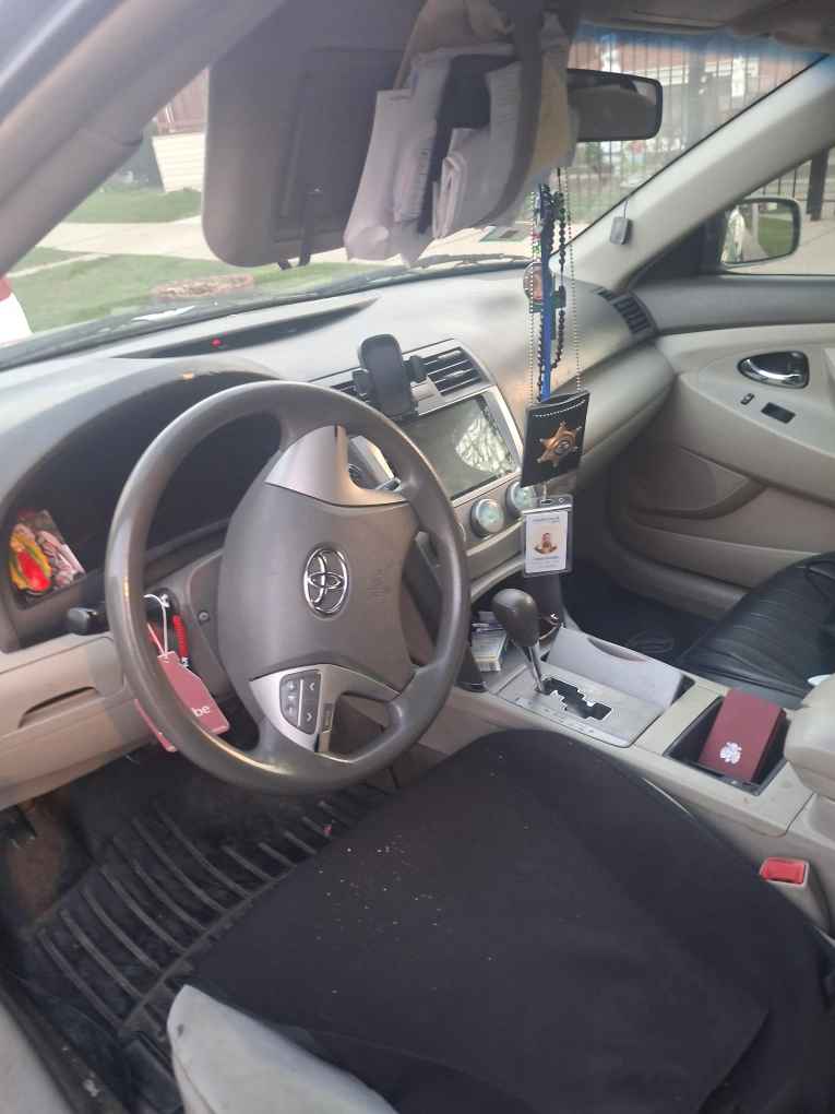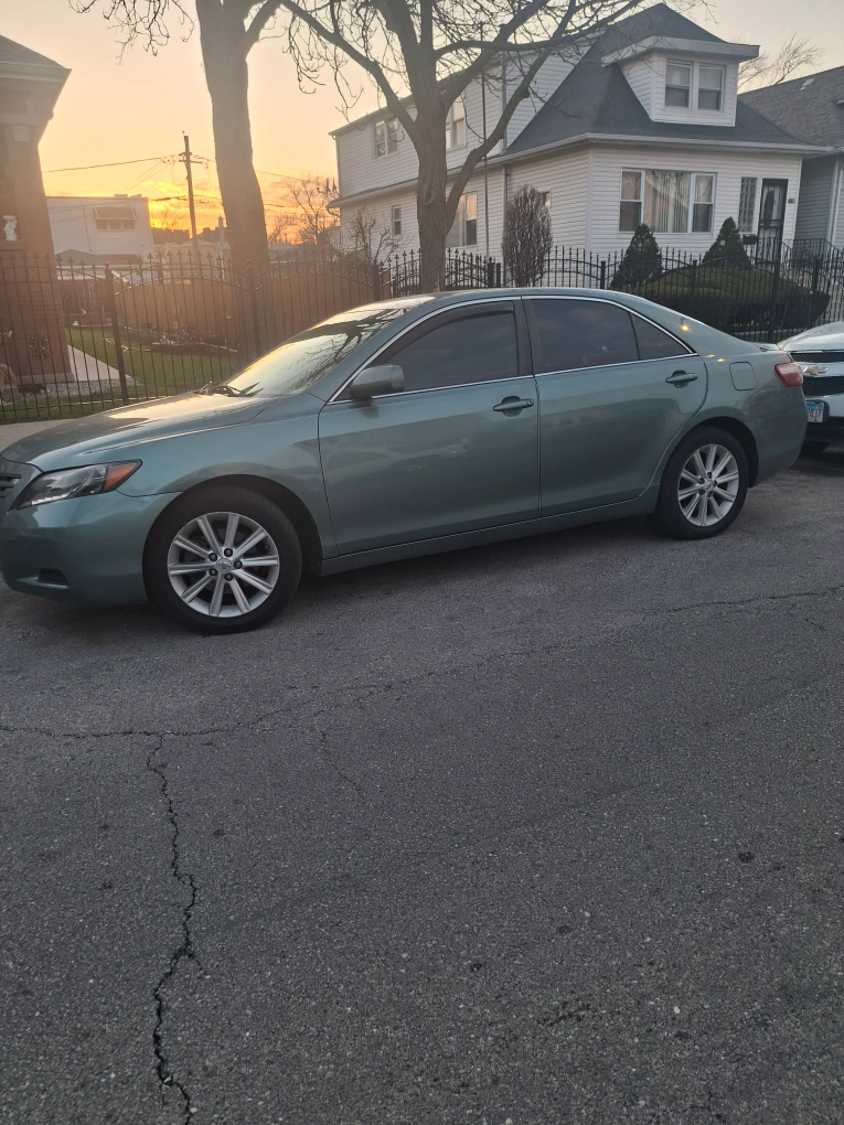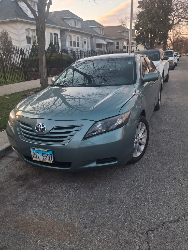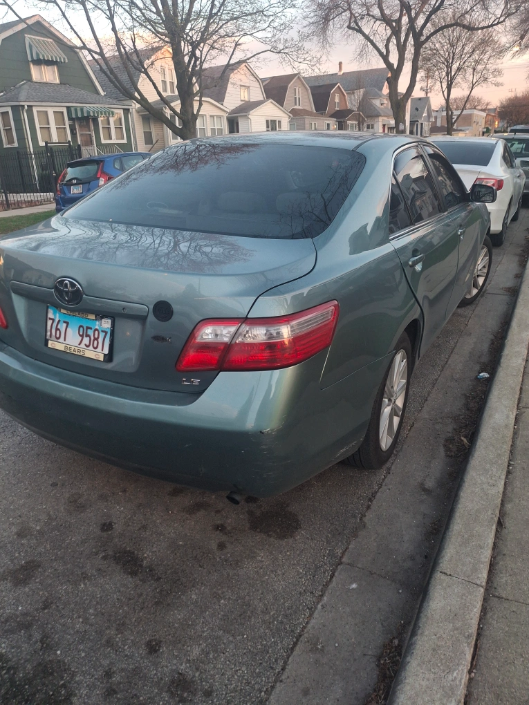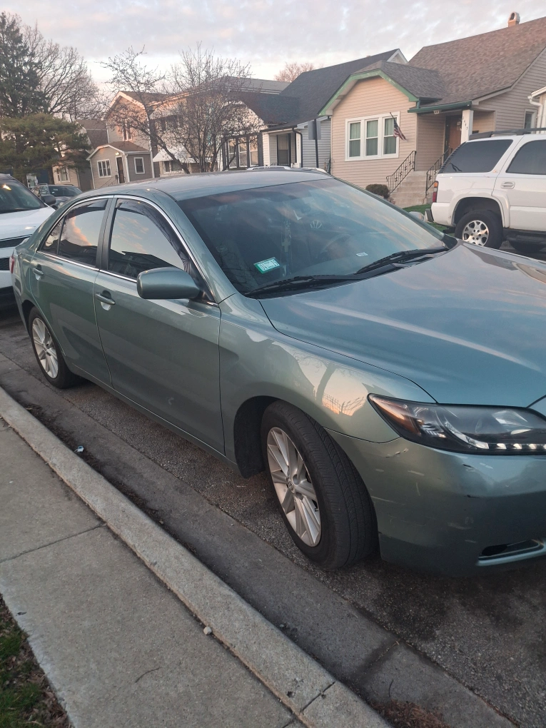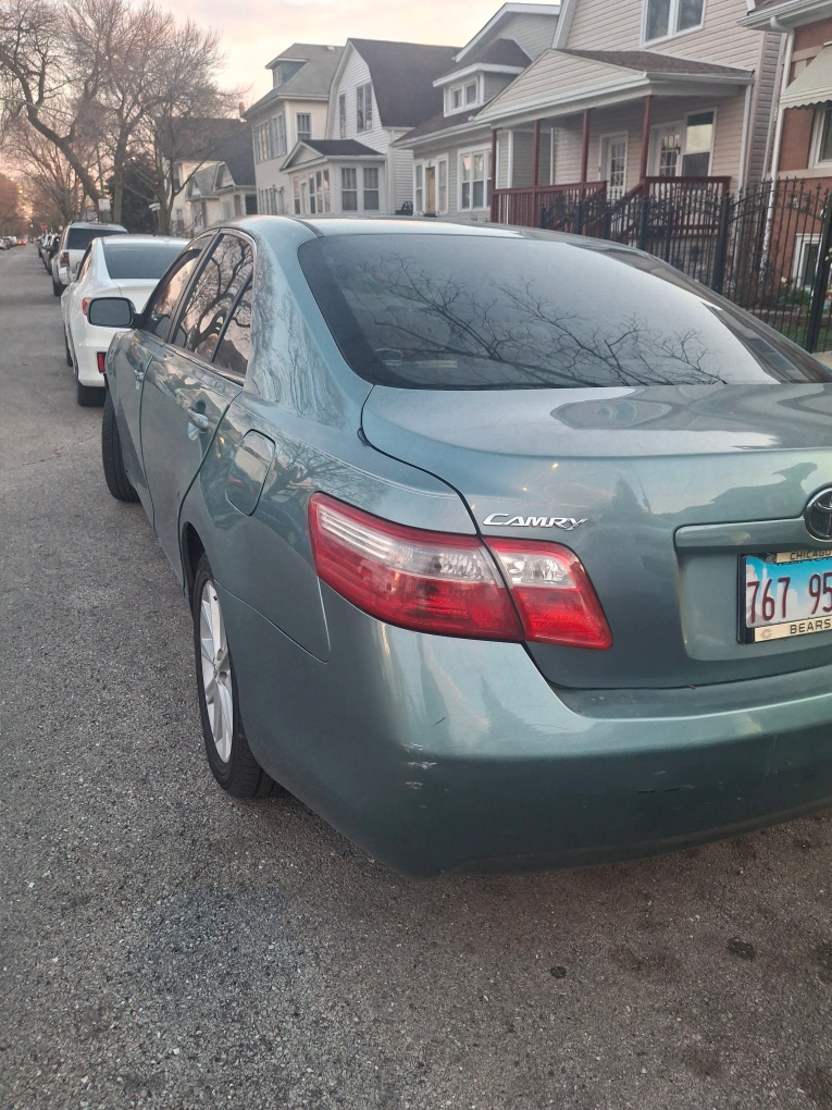 Used Toyota Camry. Four-door sedan. Green exterior. Minor scratches and dents visible. Automatic transmission. Clean title. Sold as-is.