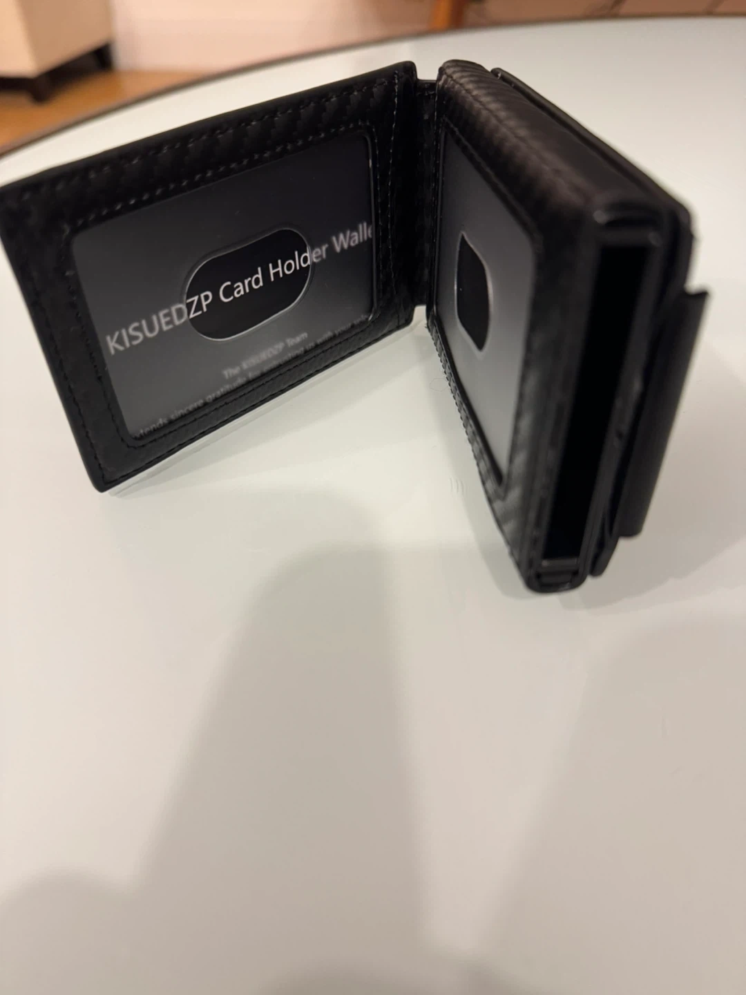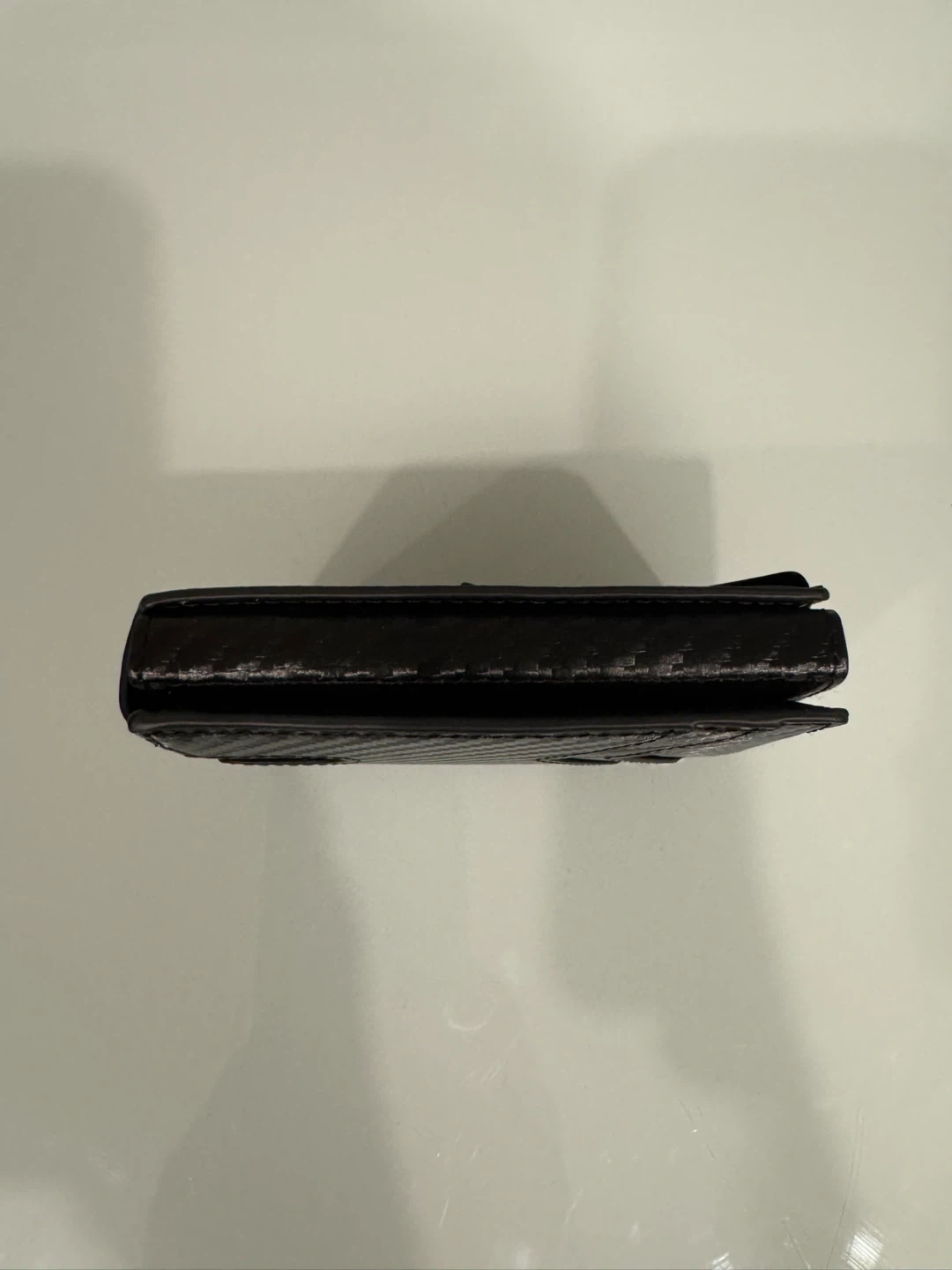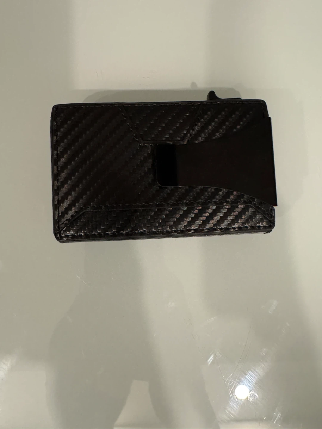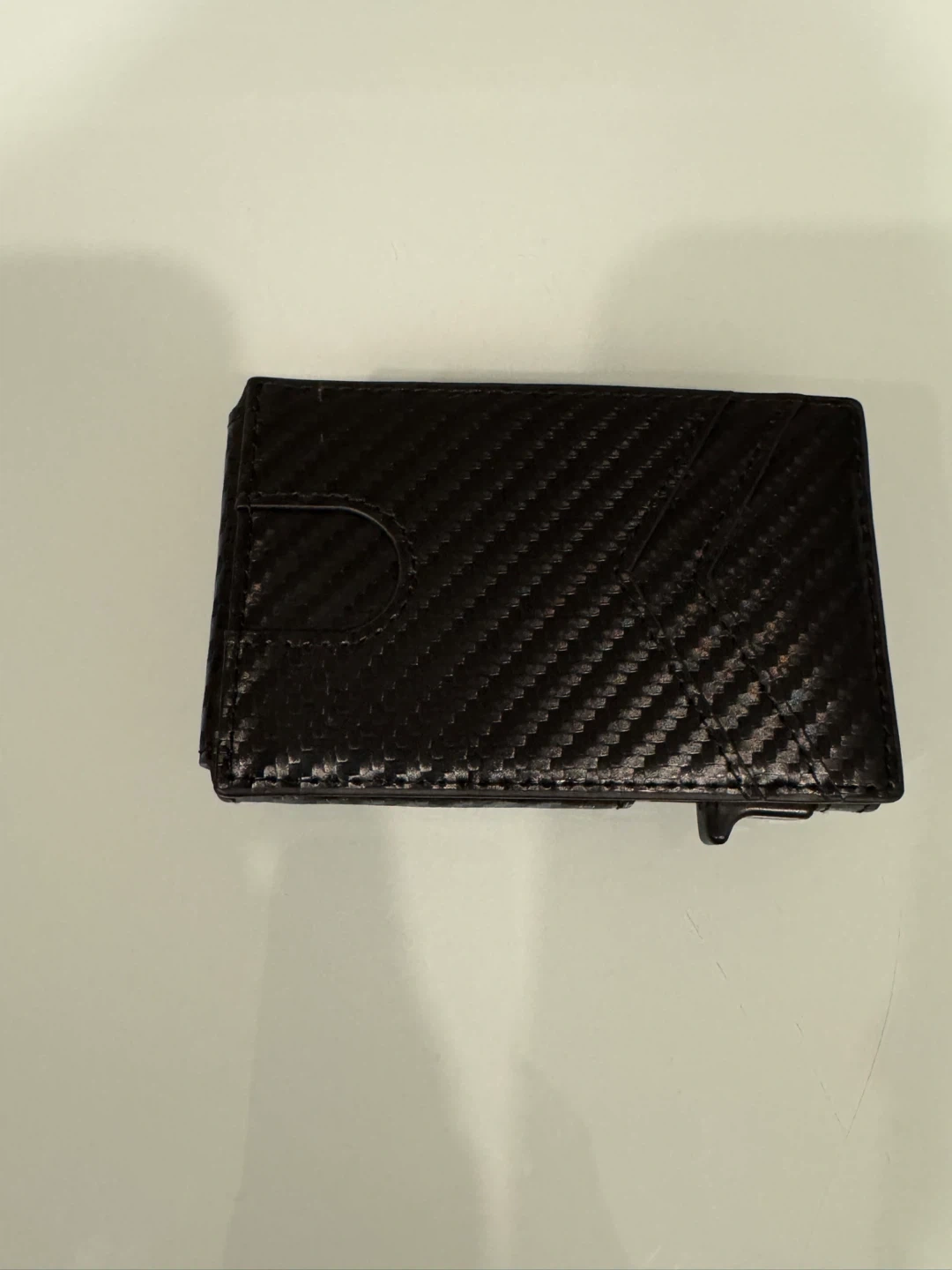This is a black card holder wallet. It's made of leather and carbon fiber material. It features multiple card slots and a money clip. It’s a pop up card holder and has RFID chip.
