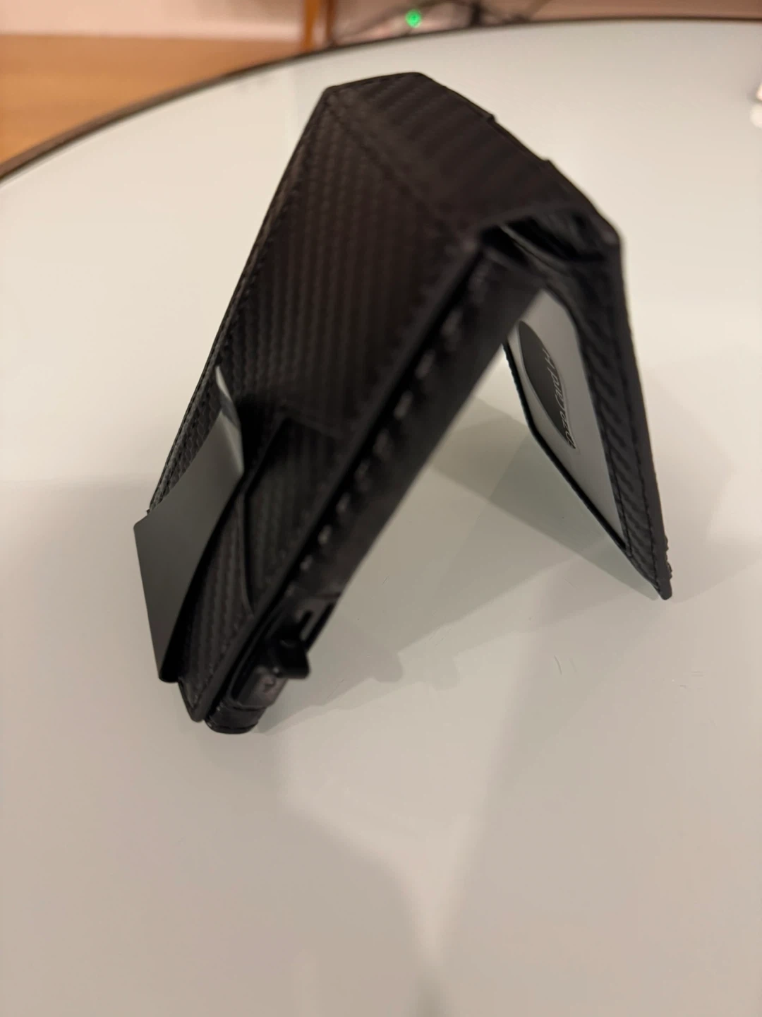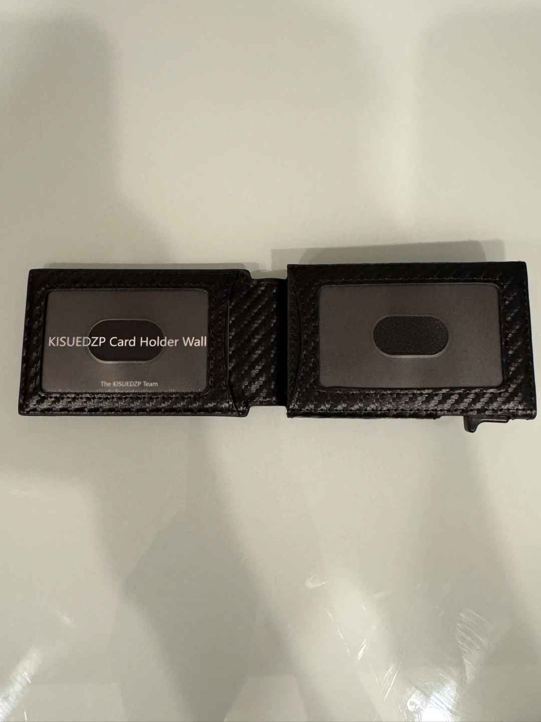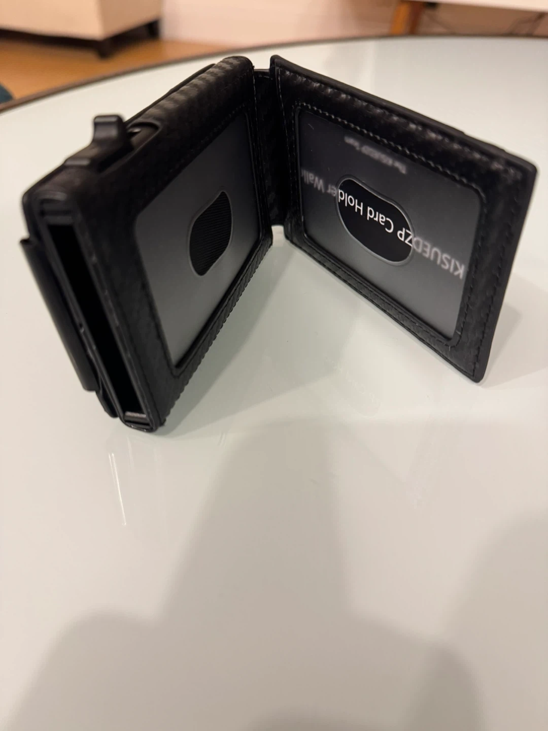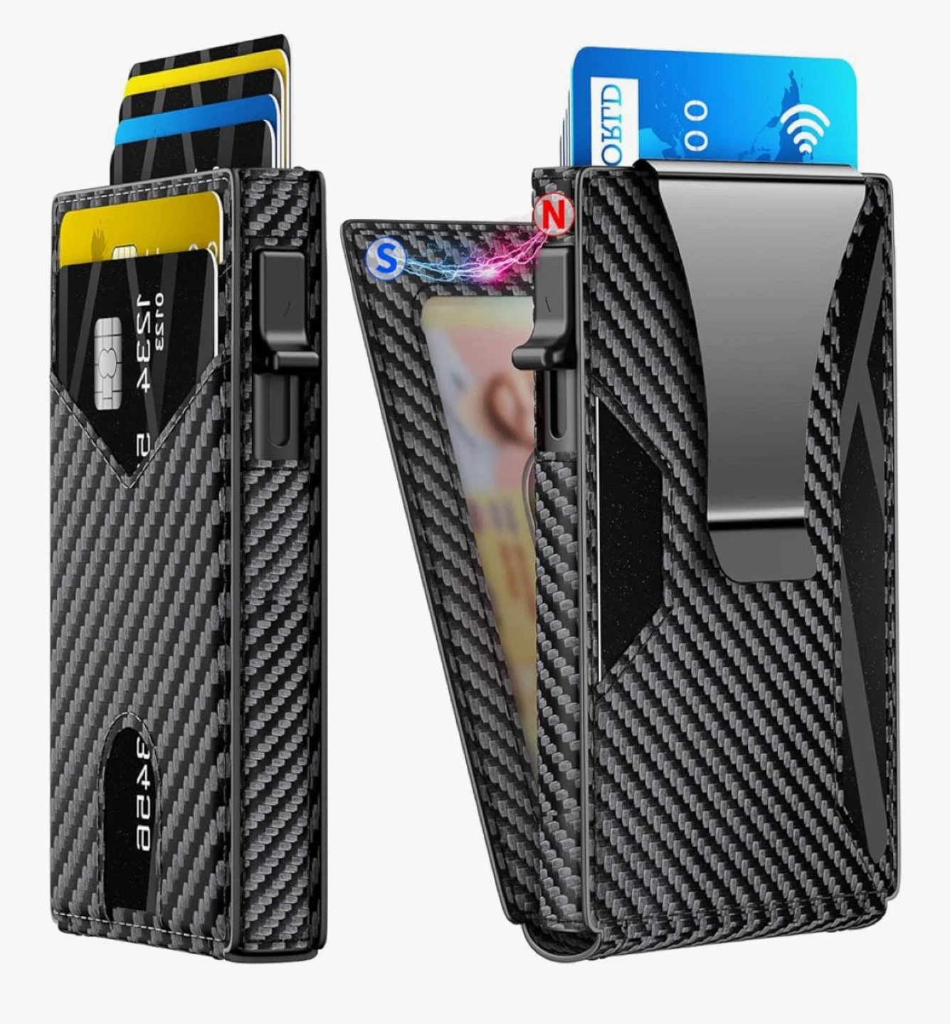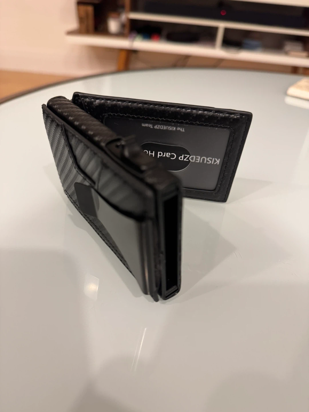 This is a black card holder wallet. It's made of leather and carbon fiber material. It features multiple card slots and a money clip. It’s a pop up card holder and has RFID chip.