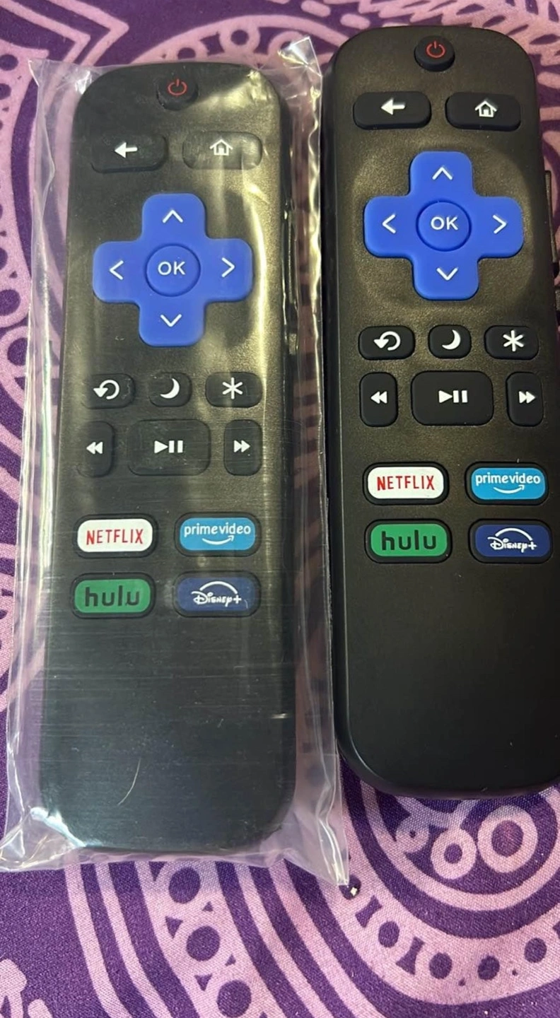 Two brand new remote controls in packaging. Both have Netflix, Hulu, and Disney+ buttons. One remote has Prime Video buttons, and the other has a power button. Both remotes have standard navigation buttons. One remote also has a button for "*" and "C".