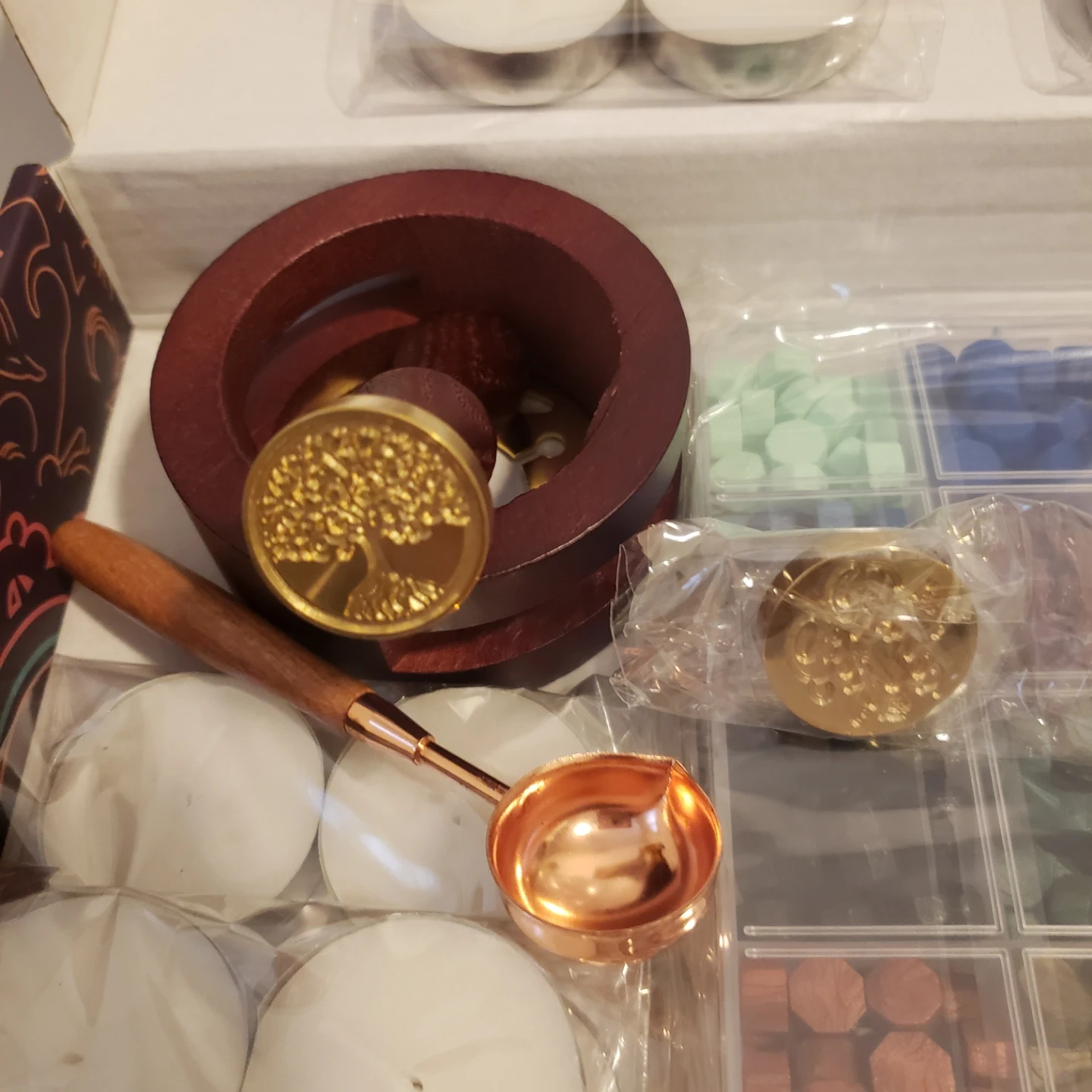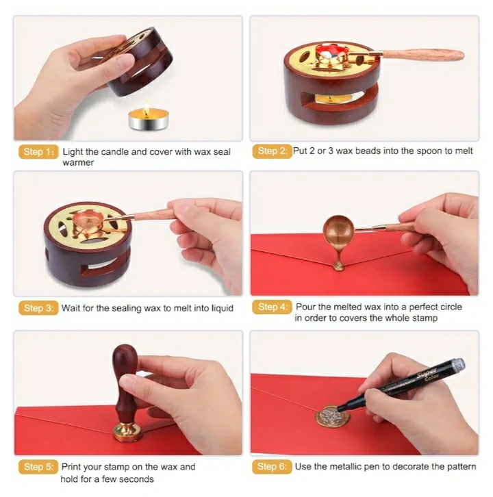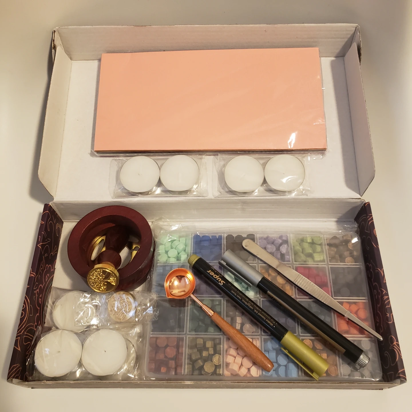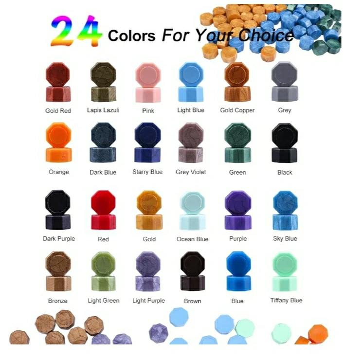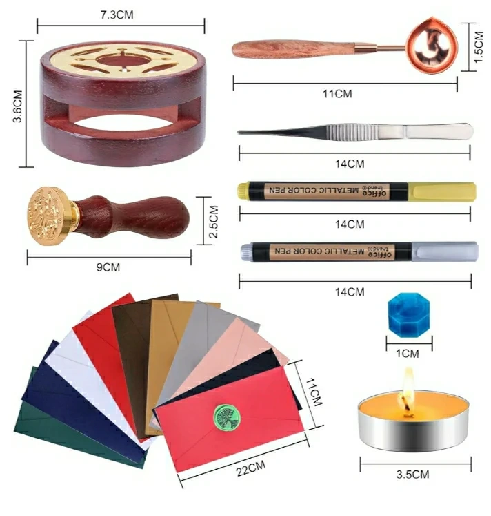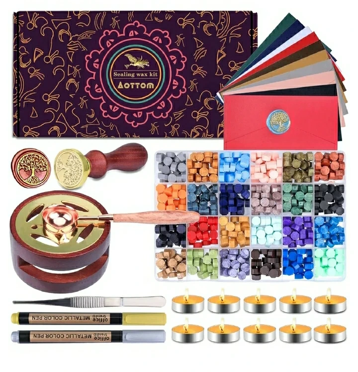 Complete sealing wax kit. Includes 24-color wax beads, wooden handle stamp, sealing wax spoon, tweezers, metallic pens, and tea lights. Perfect for DIY projects and crafting.