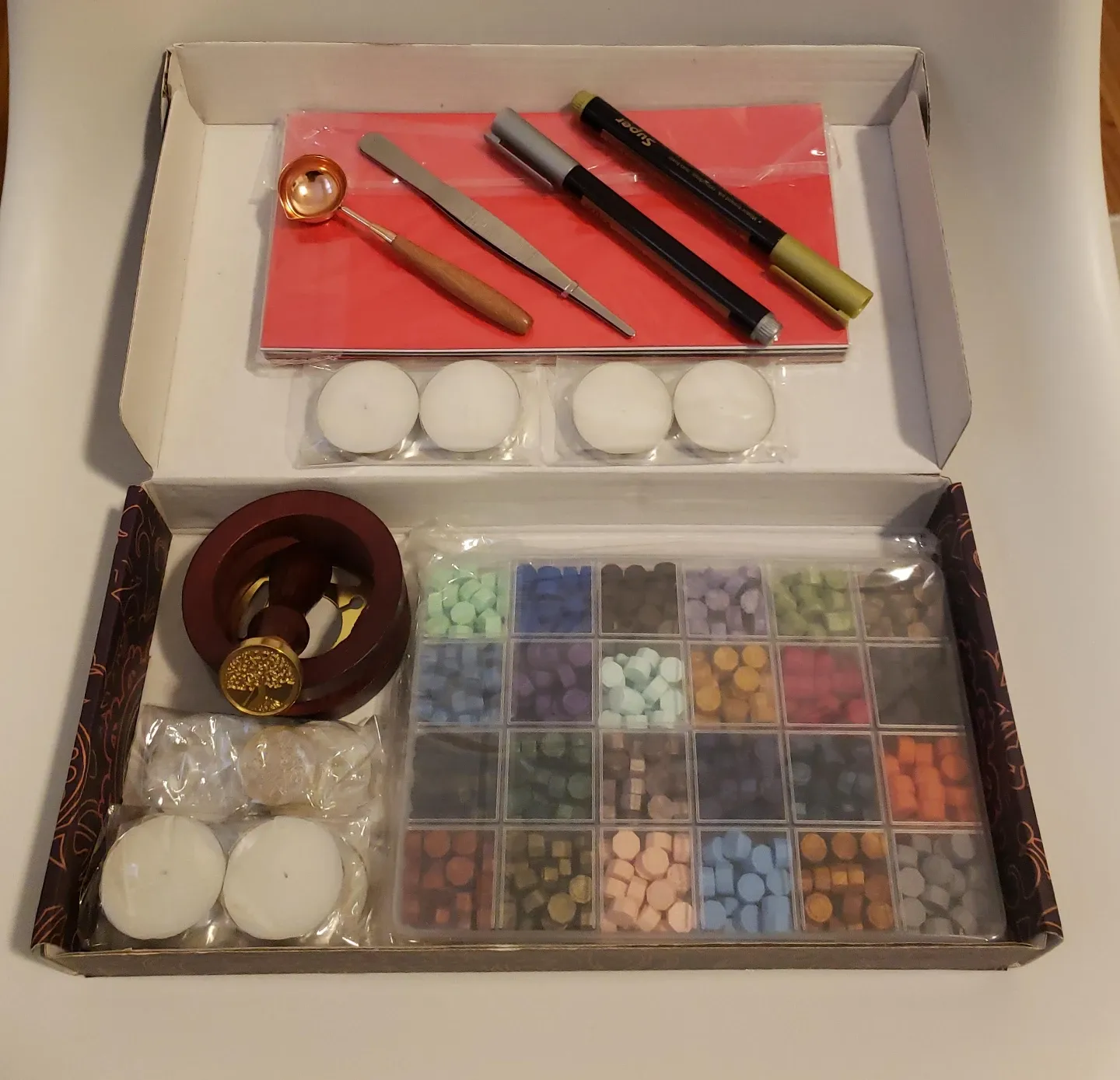 Complete sealing wax kit. Includes 24-color wax beads, wooden handle stamp, sealing wax spoon, tweezers, metallic pens, and tea lights. Perfect for DIY projects and crafting.