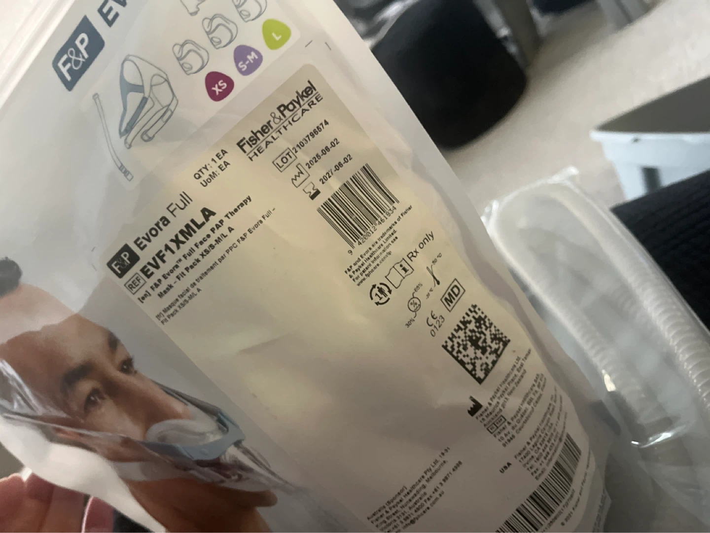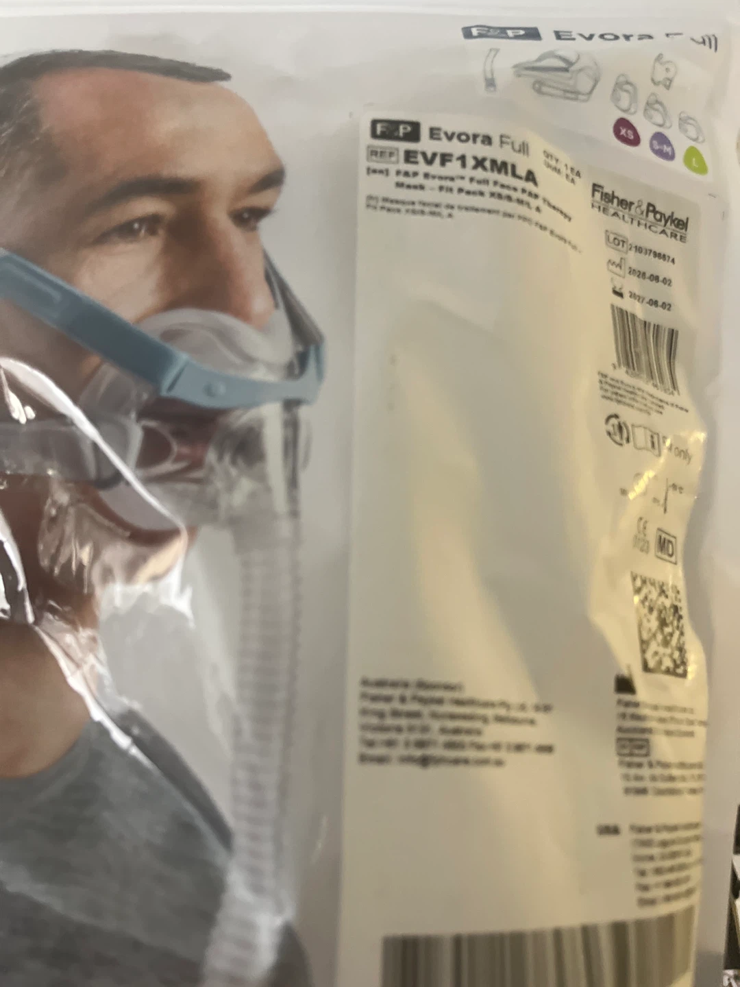 This is a Fisher & Paykel Evora Full Face CPAP mask. It's the EVF1XMLA model. It includes a full face mask and therapy cushion. Includes original packaging. Includes xtra hose.