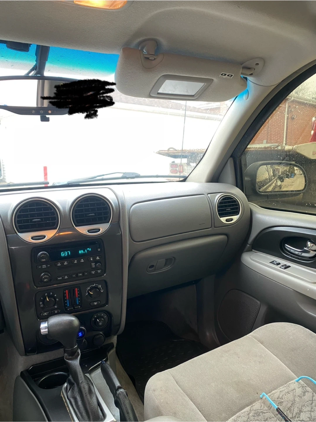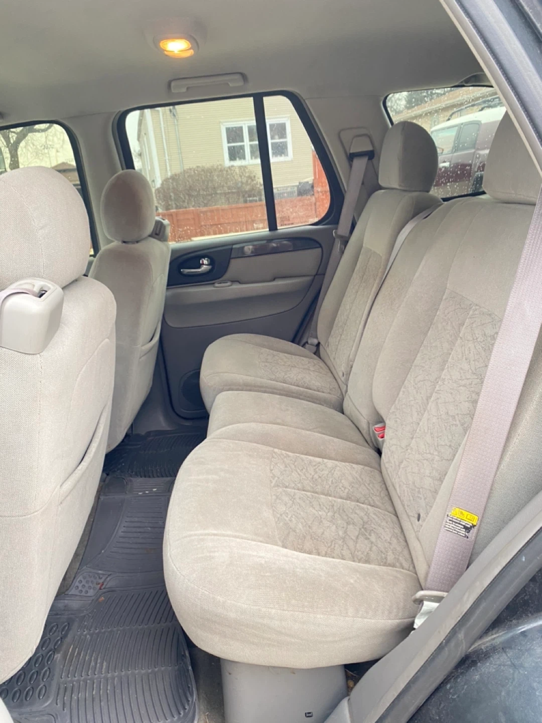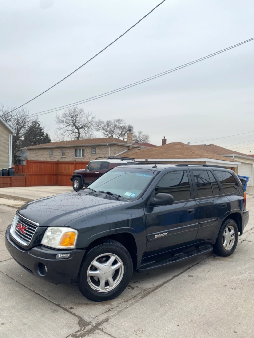 Dark gray GMC Envoy SUV with tan interior. Features cloth seats and a roof rack. This vehicle is a reliable SUV, perfect for families or anyone needing extra cargo space.