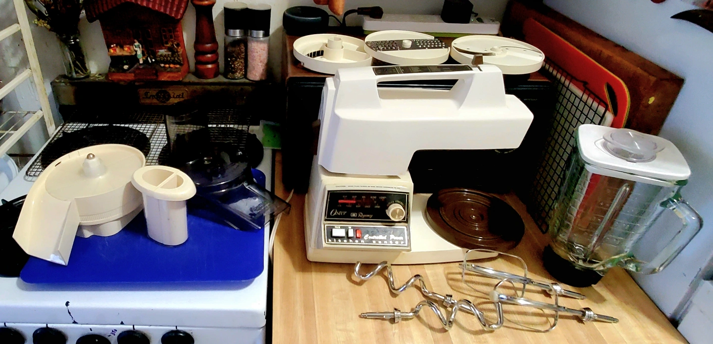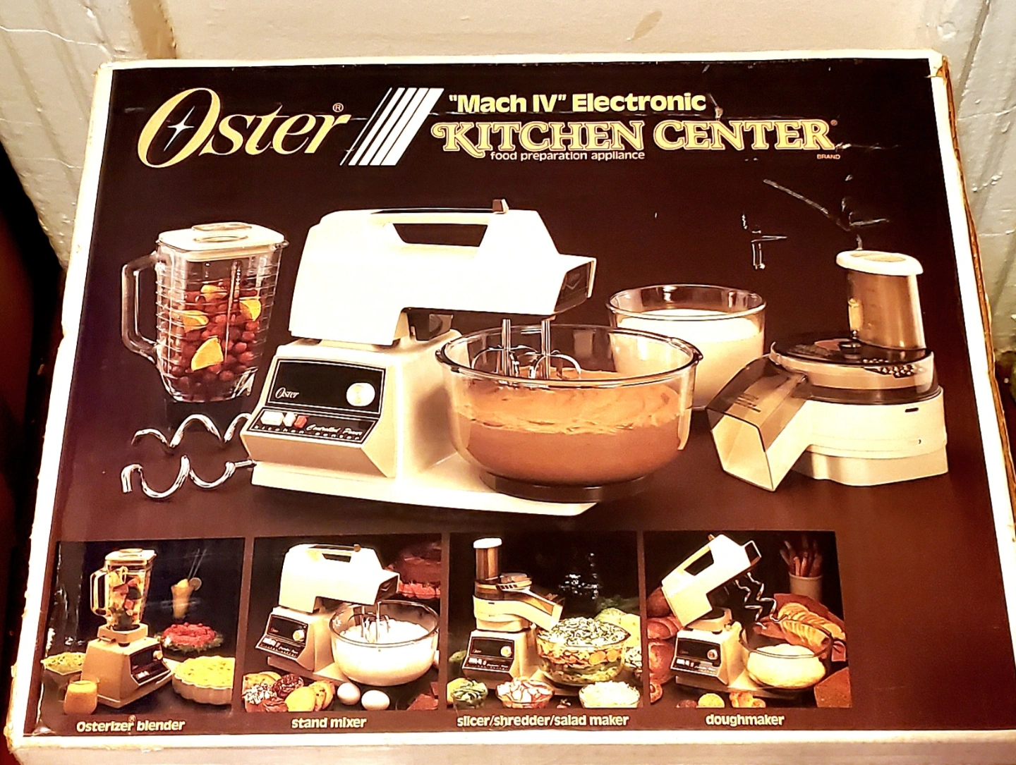 Oster "Mach IV" Kitchen Center, a vintage all-in-one food preparation appliance. It combines several kitchen tools into one unit including: