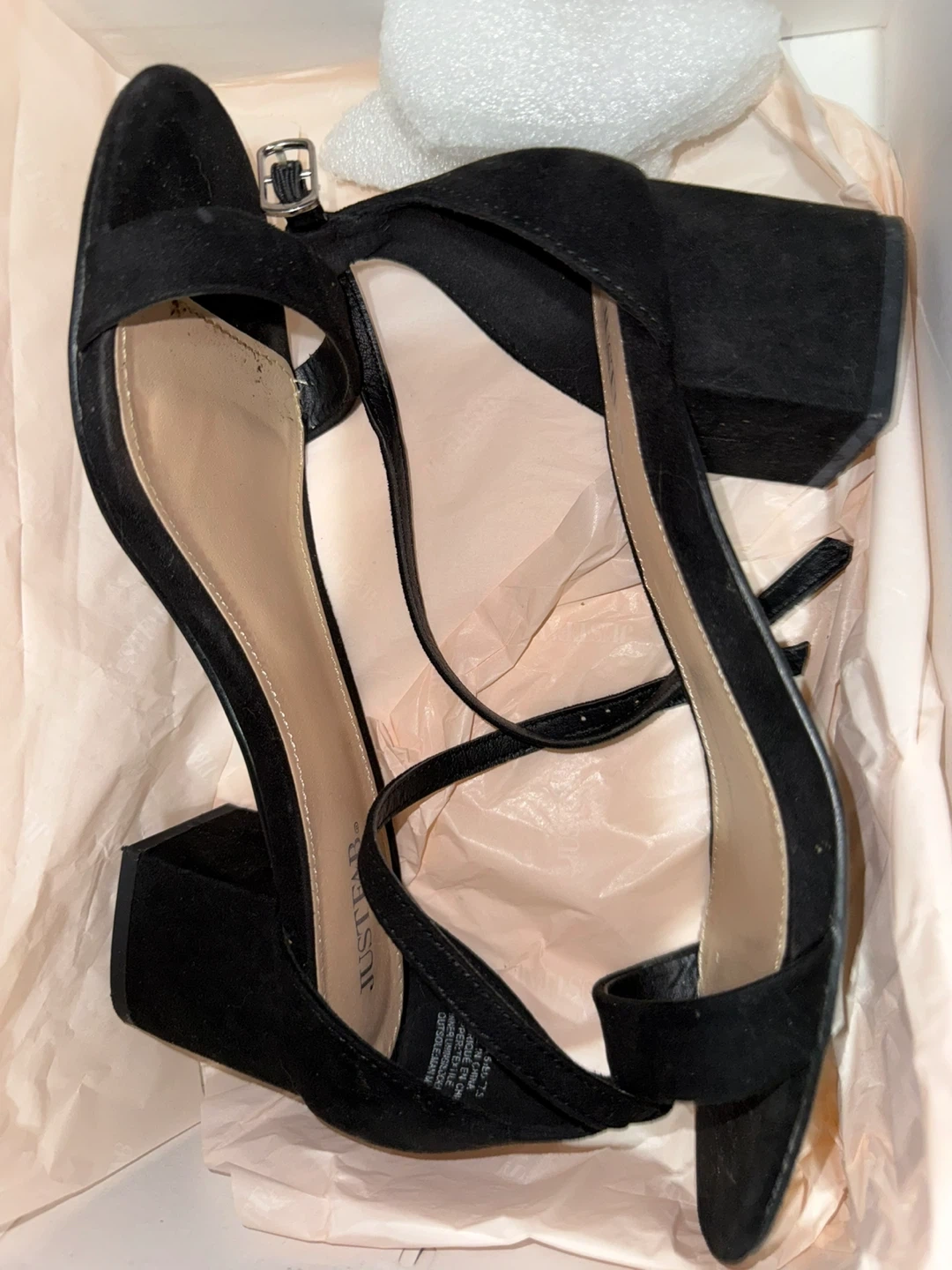 These are black suede dress sandals from JustFab. They're a size 7 and feature a block heel with ankle straps. Ready for any occasion!