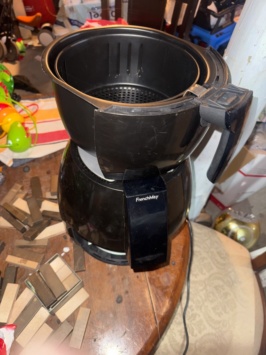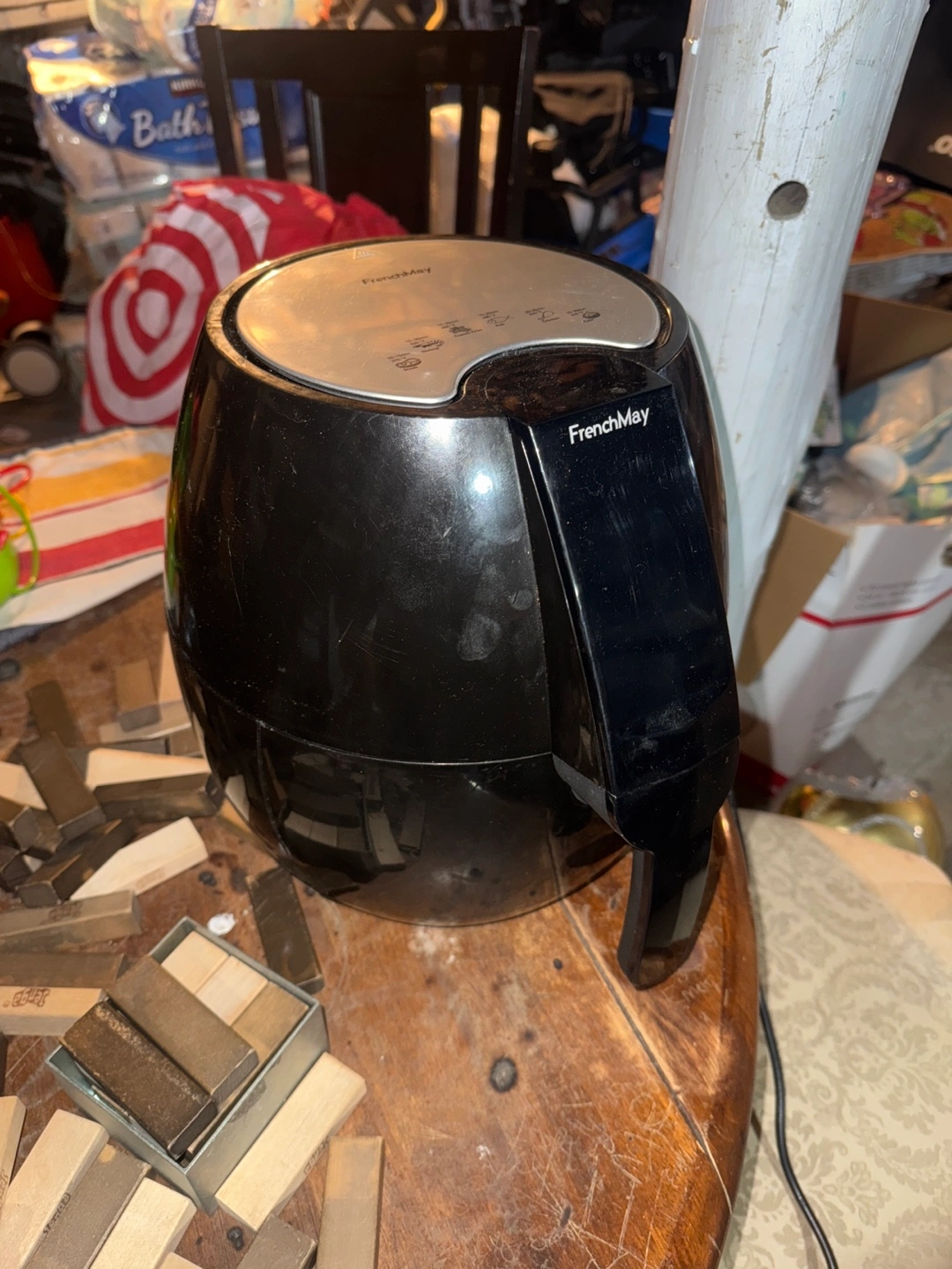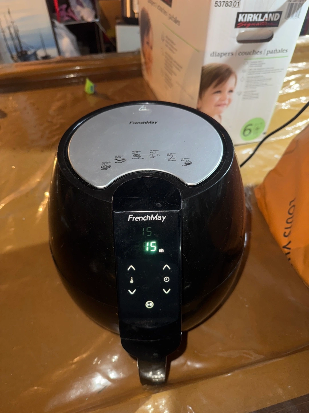 Digital air fryer. Black and silver. Includes removable basket and crisper pan. Some minor cosmetic imperfections.