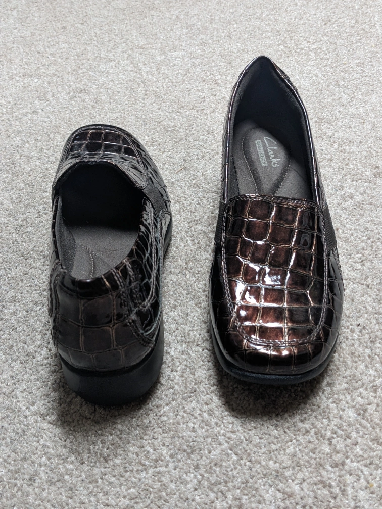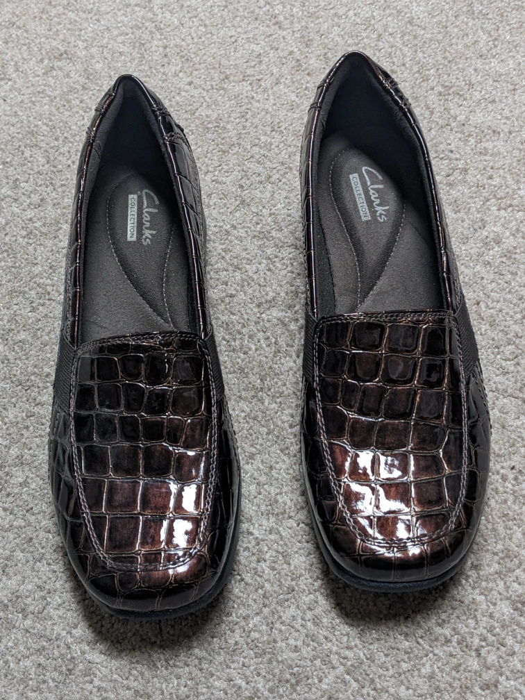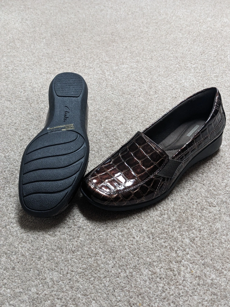These are a pair of women's Clarks slip-on shoes with a crocodile embossed pattern. They are a plum/brown colour. The shoes are in great condition.