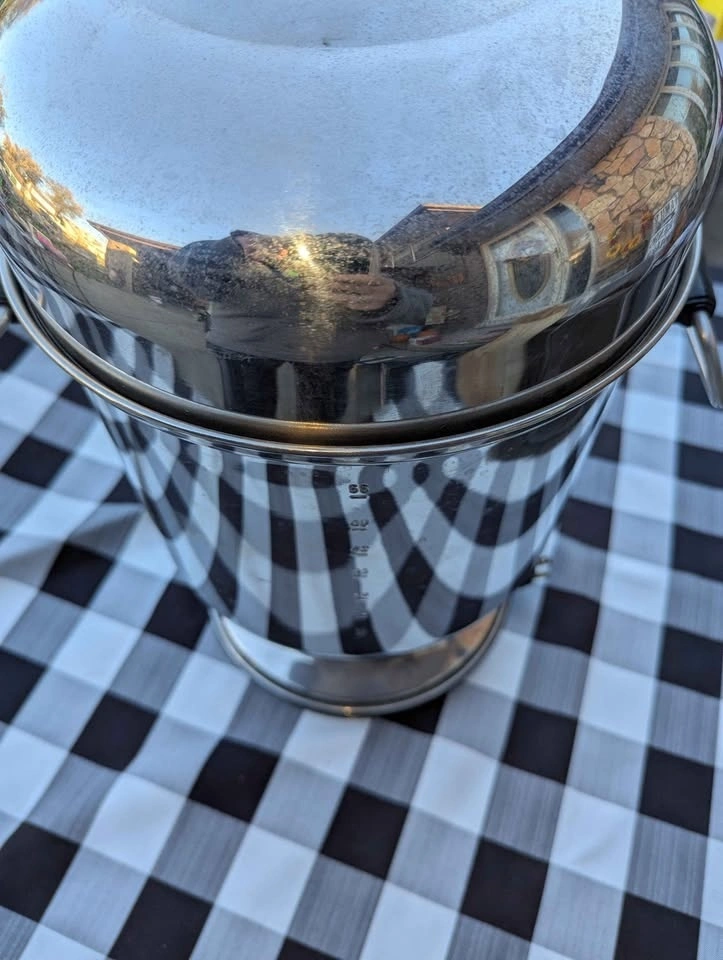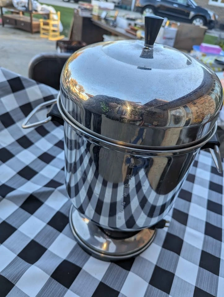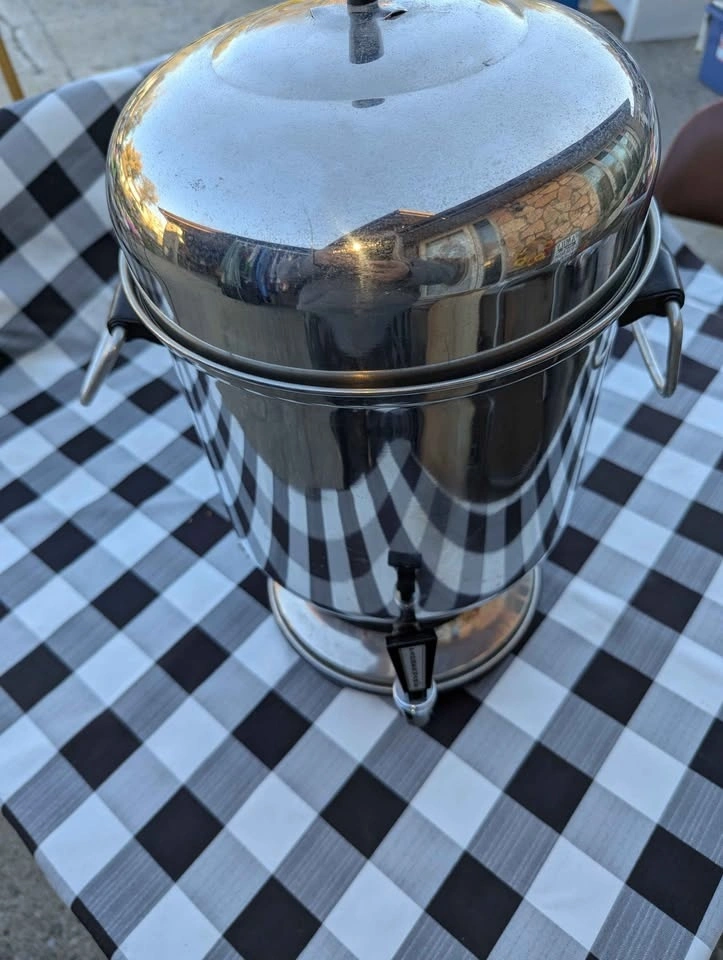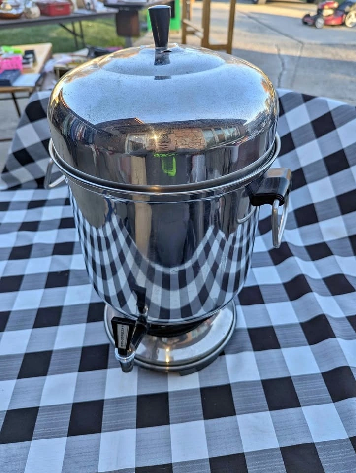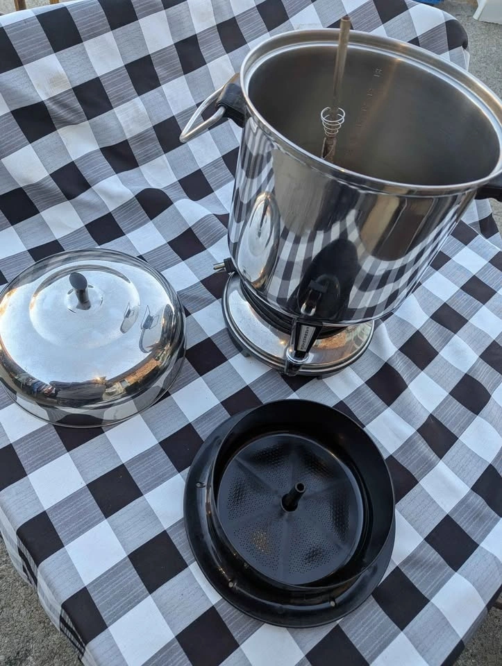 Condition: Excellent, shiny, and clean inside and out. Tested and works perfectly. Comes with all original parts, including the coffee basket, stem, and lid.