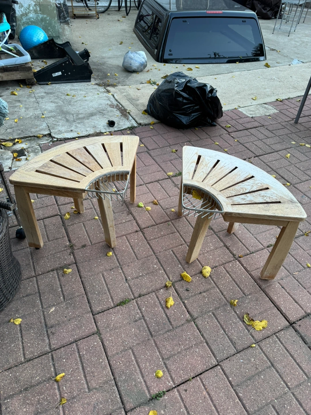 Selling a set of two half-round outdoor benches. They appear to be made of light-colored wood with a metal support structure underneath. Each piece measures approximately 30 inches at its widest point. Perfect for creating a cozy seating area in your garden or patio