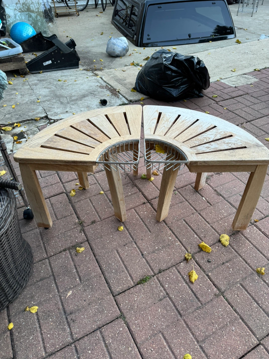 Selling a set of two half-round outdoor benches. They appear to be made of light-colored wood with a metal support structure underneath. Each piece measures approximately 30 inches at its widest point. Perfect for creating a cozy seating area in your garden or patio