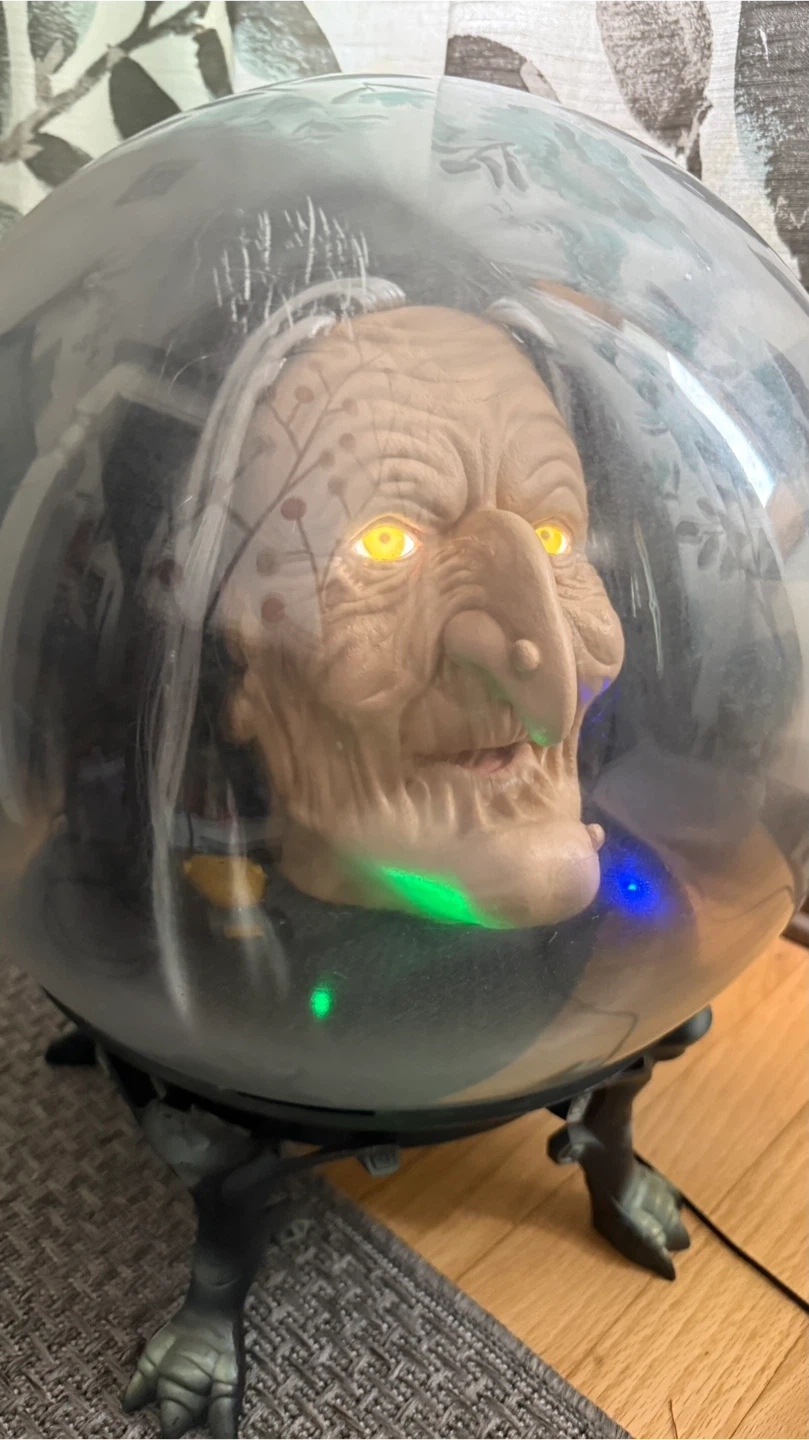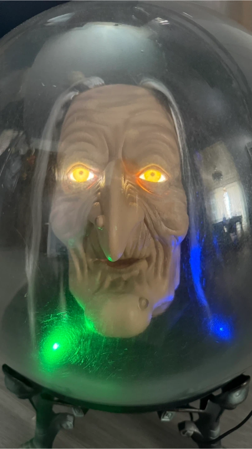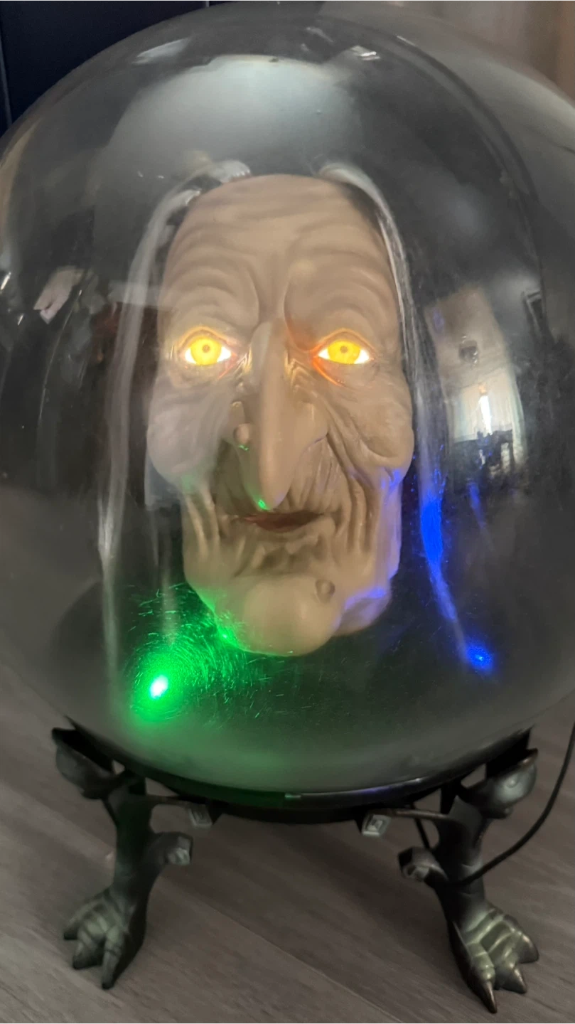 Creepy animated witch head inside a crystal ball with glowing yellow eyes and colorful lights. It's a fun Halloween decoration that's sure to spook your guests! Light sound