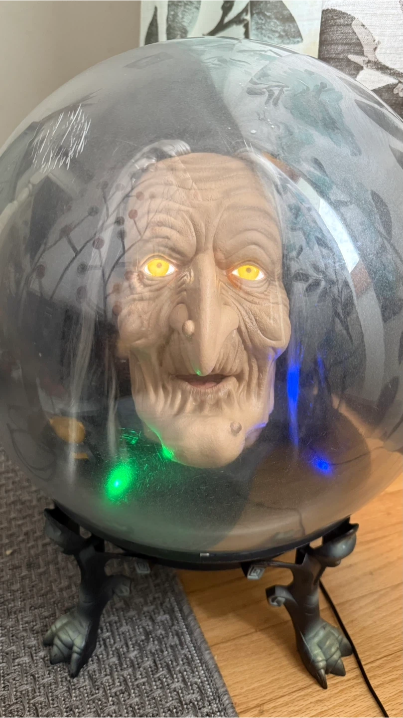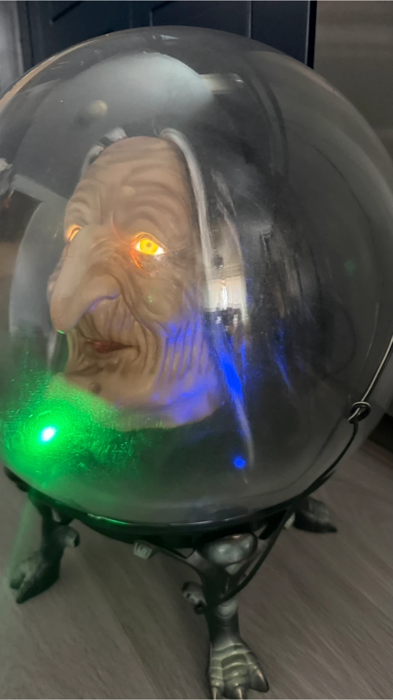 Creepy animated witch head inside a crystal ball with glowing yellow eyes and colorful lights. It's a fun Halloween decoration that's sure to spook your guests! Light sound