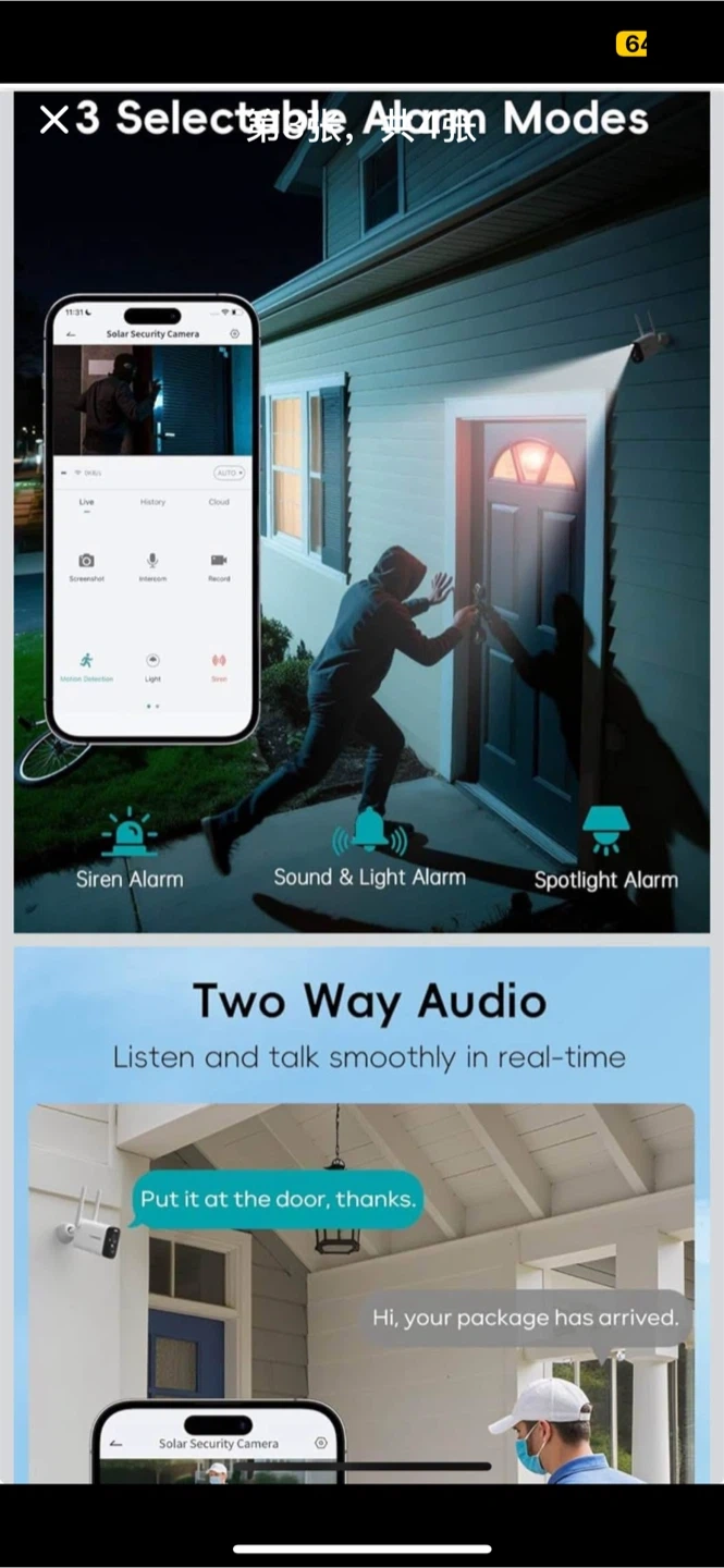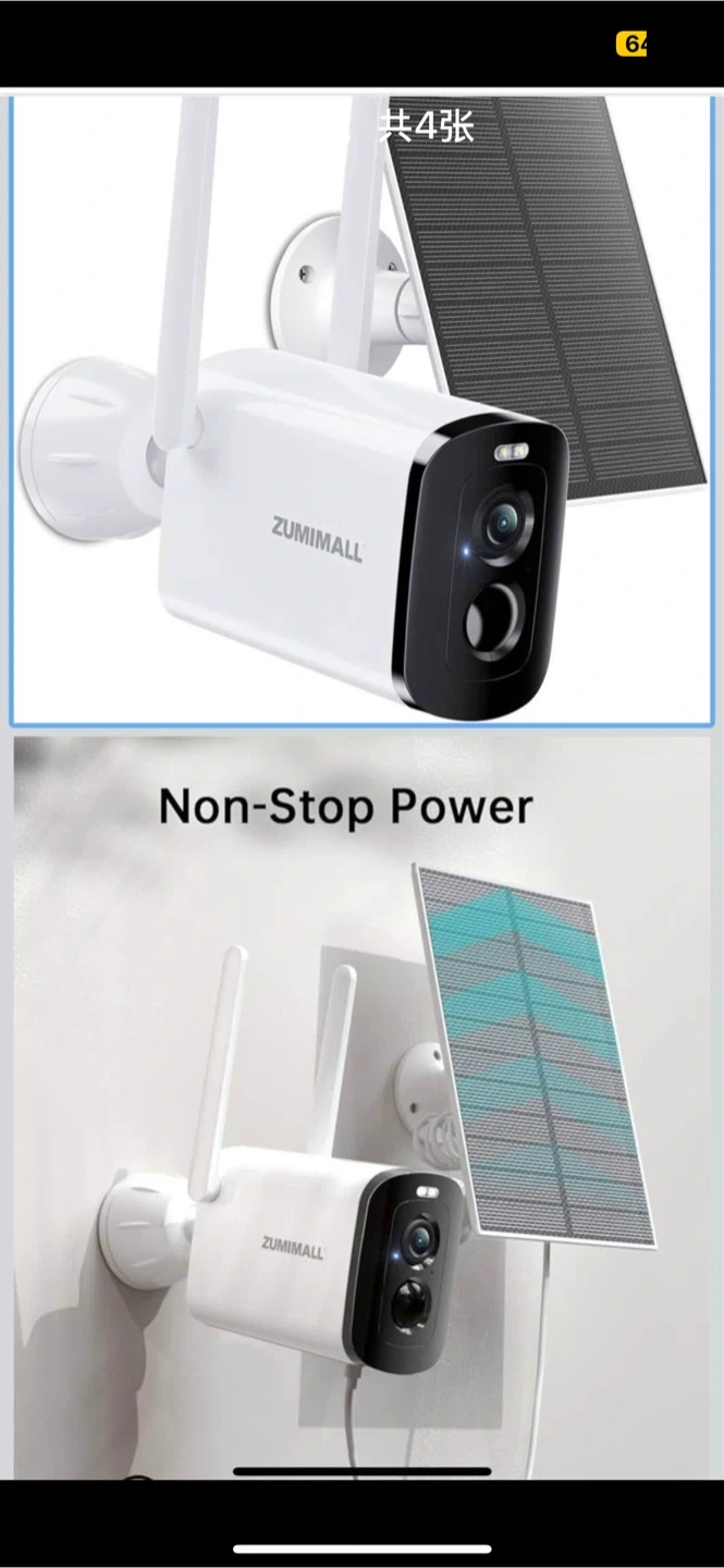 10Selling a Zumimall wireless outdoor security camera. It features non-stop power and is IP66 weatherproof, so it can work under any conditions. The camera supports 2.4GHz WiFi connection and has two-way audio for smooth real-time communication. It also has selectable alarm modes.