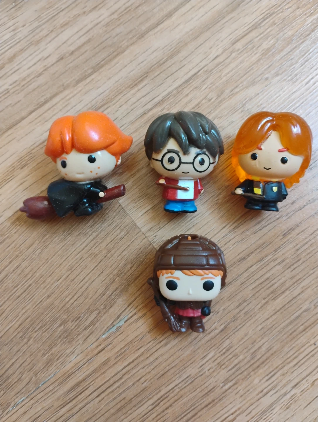 Set of four Harry Potter character figures. Includes Harry Potter, Ron Weasley, George Weasley, and a Ron Weasley Quidditch player. Three of these collectible figures are pencil toppers. The Quidditch Ron is plastic.