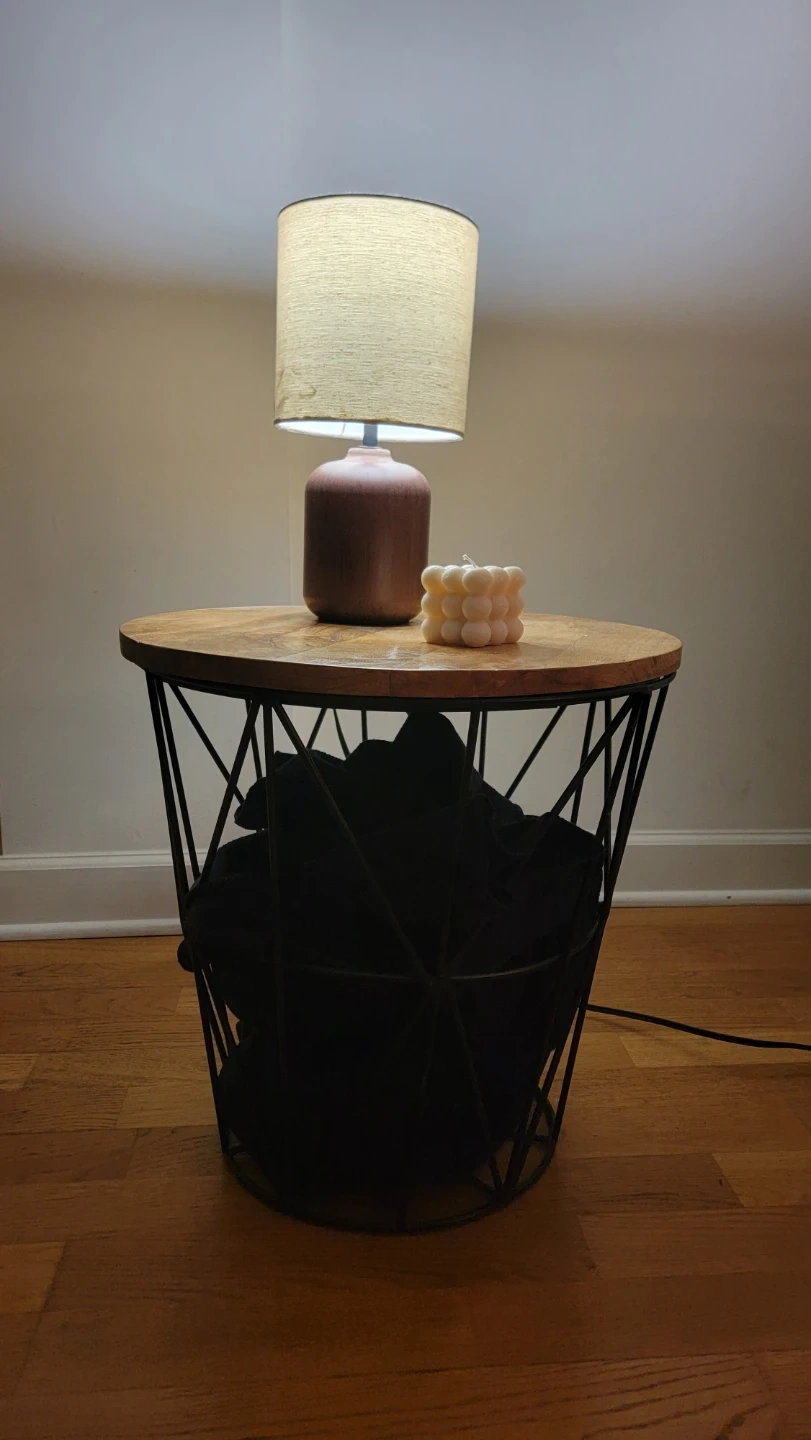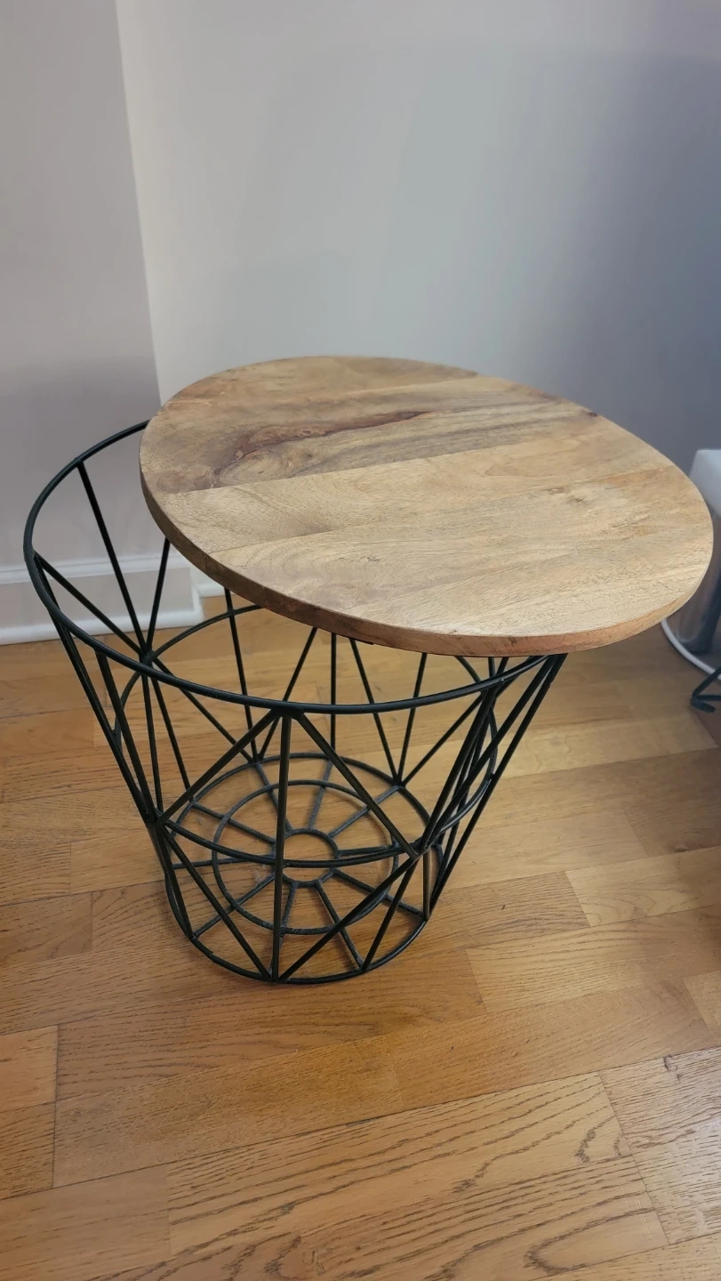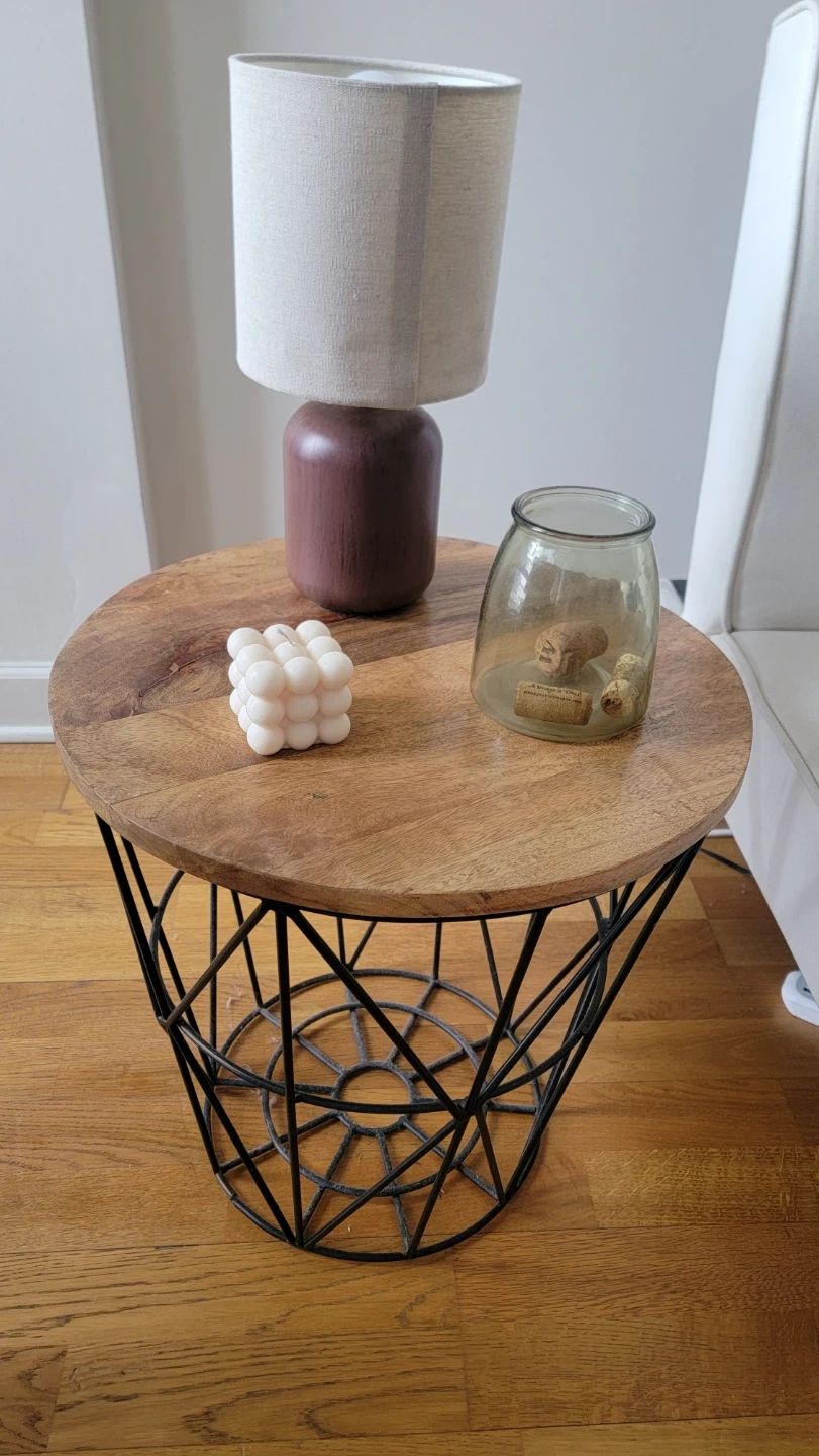 This round side table features a natural wood top with a unique geometric black metal base. It's perfect for placing a lamp, decor, or your favorite book. It includes storage space on the inside. Ideal for blankets.