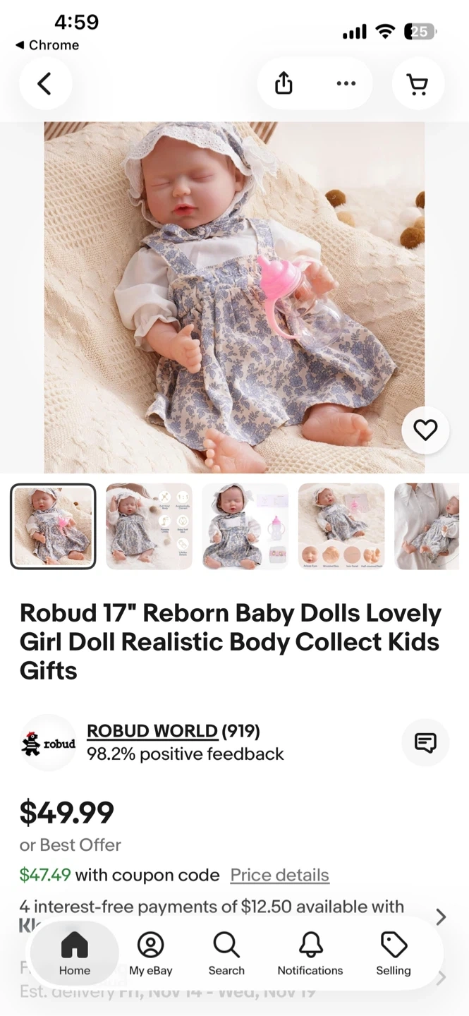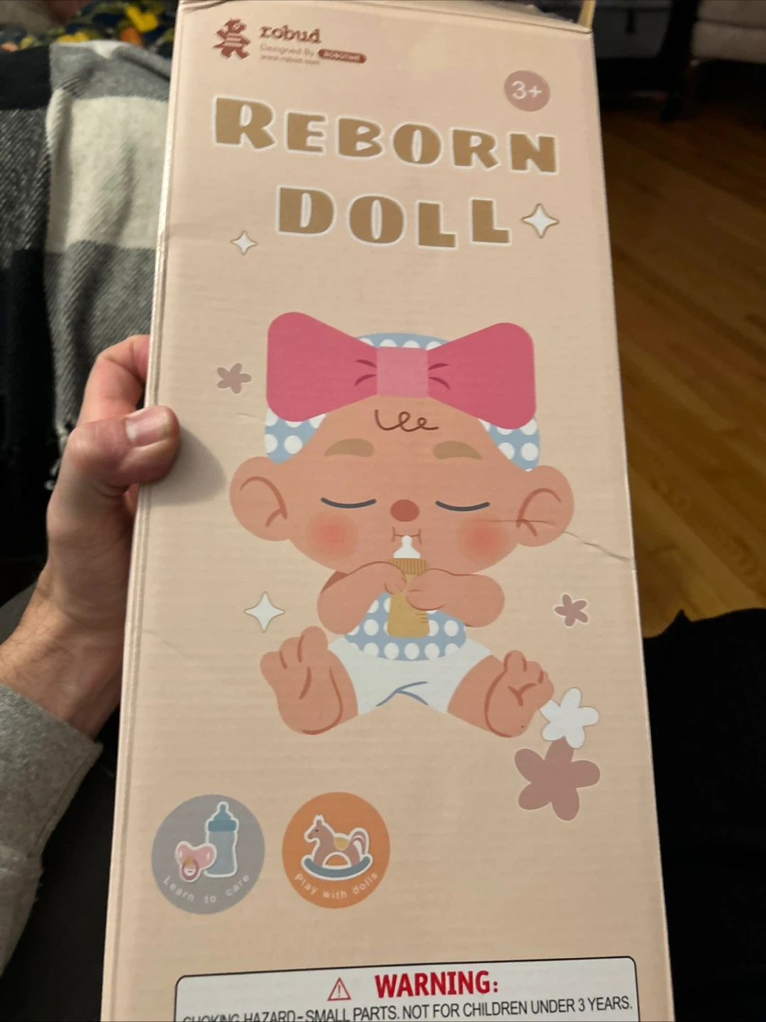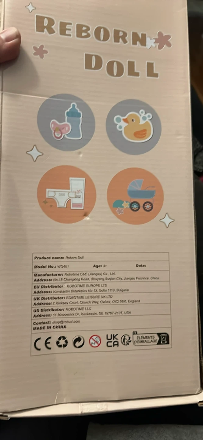 I'm selling a brand new Robud 17-inch reborn baby doll, still in its original box! This lovely girl doll has a realistic body and is perfect for collecting or as a gift for kids. The box indicates it's suitable for ages 3+.