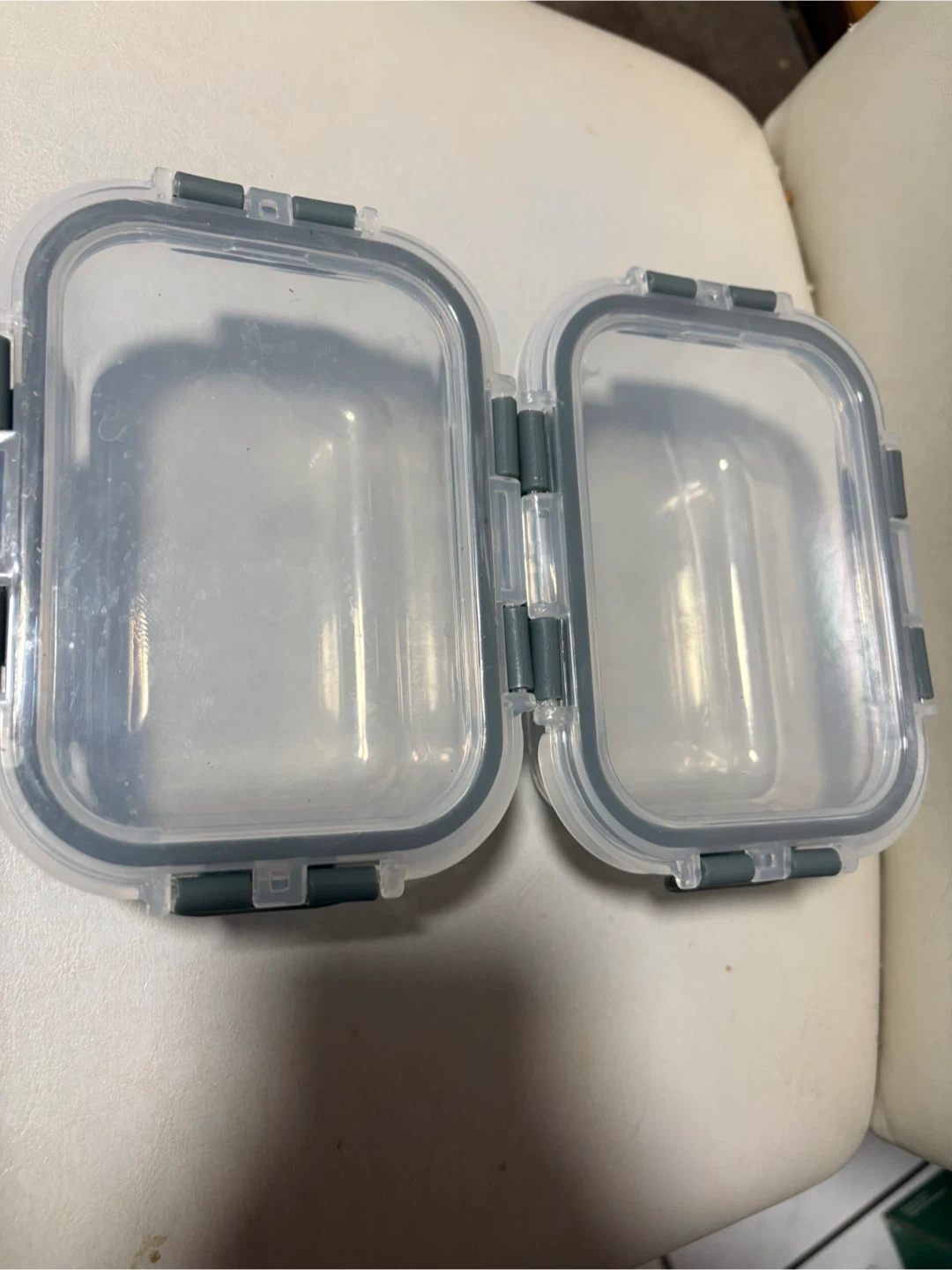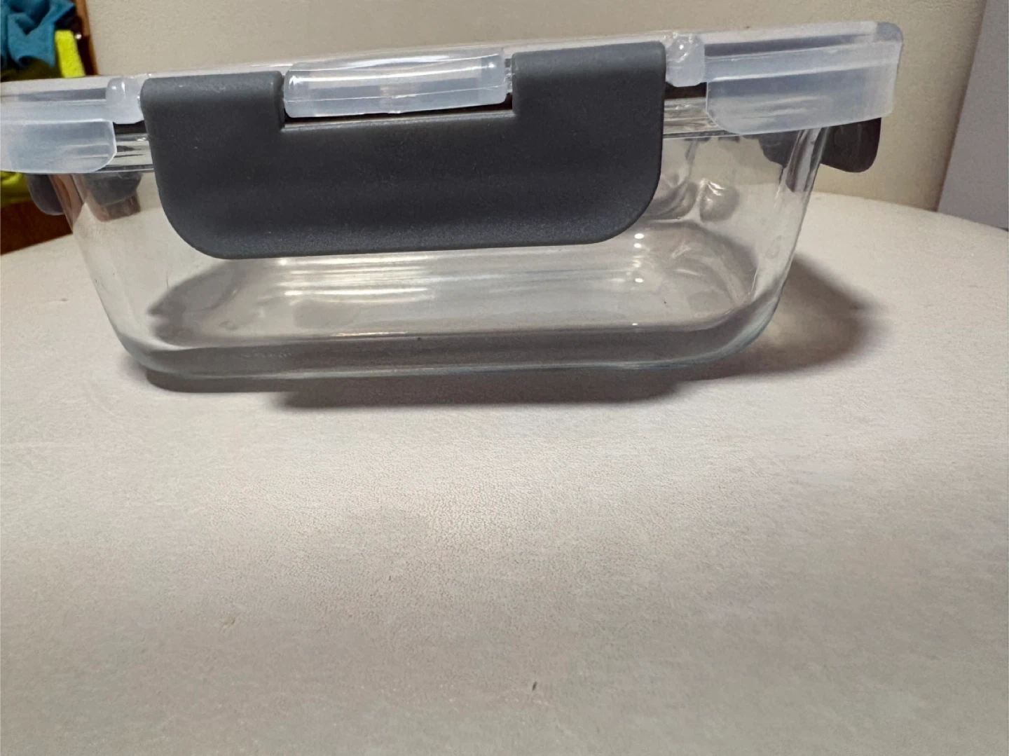 Glass food storage container with a gray, airtight locking lid. It's made of durable glass and perfect for storing leftovers or meal prepping. Keep your food fresh with this practical container!