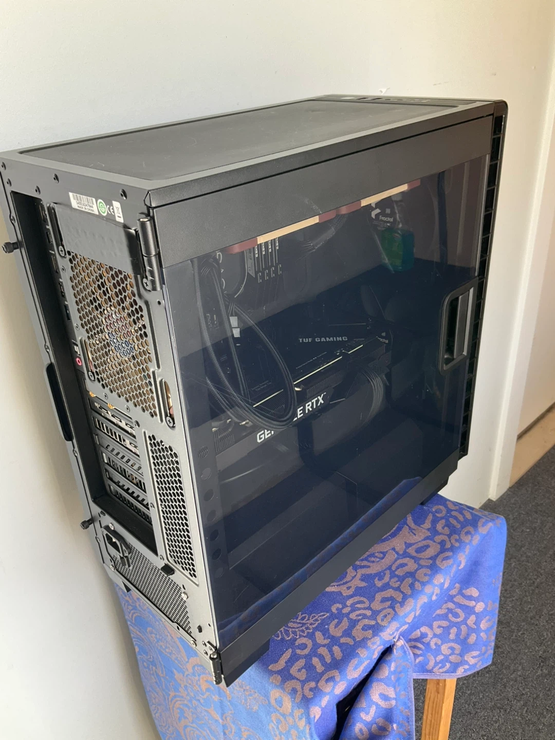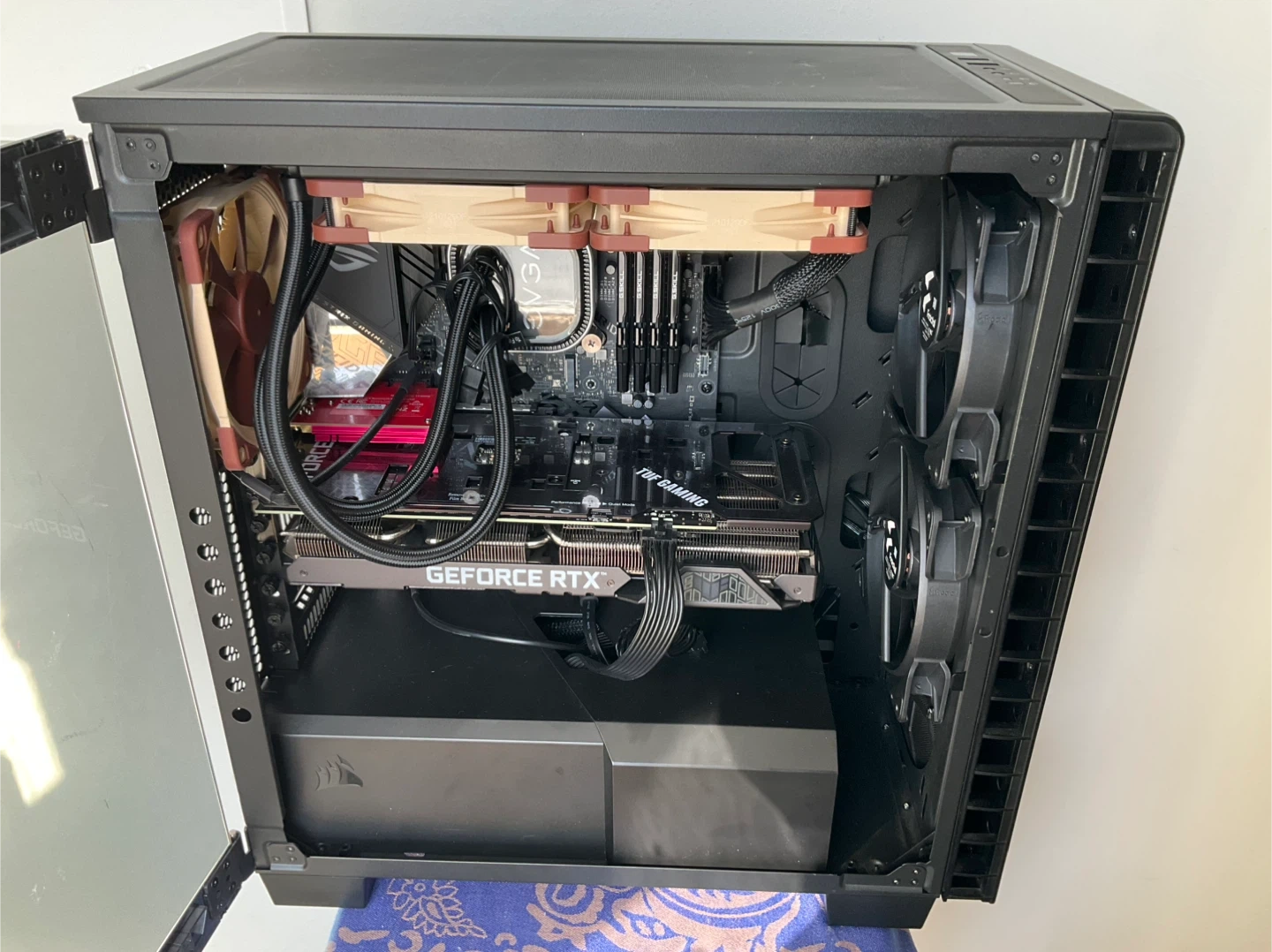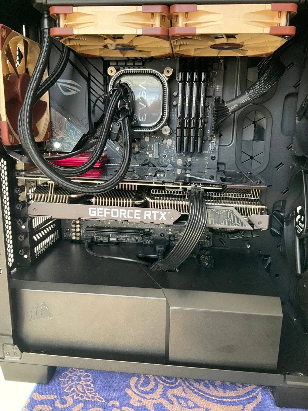This is a custom-built gaming PC featuring a GeForce RTX graphics card and an EVGA liquid cooler. It's housed in a sleek black case with a tempered glass side panel. Multiple fans ensure good airflow for optimal performance. I have a monitor available. Wire keyboard and gaming mouse included. Cash or Zelle. Door pick up , no delivery.