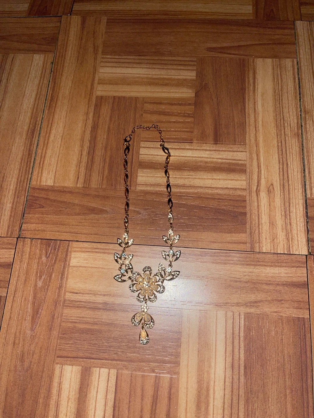 A stunning gold-tone necklace featuring a large floral pendant adorned with clear rhinestones. It has an adjustable link chain. Perfect for adding a touch of sparkle to any outfit!