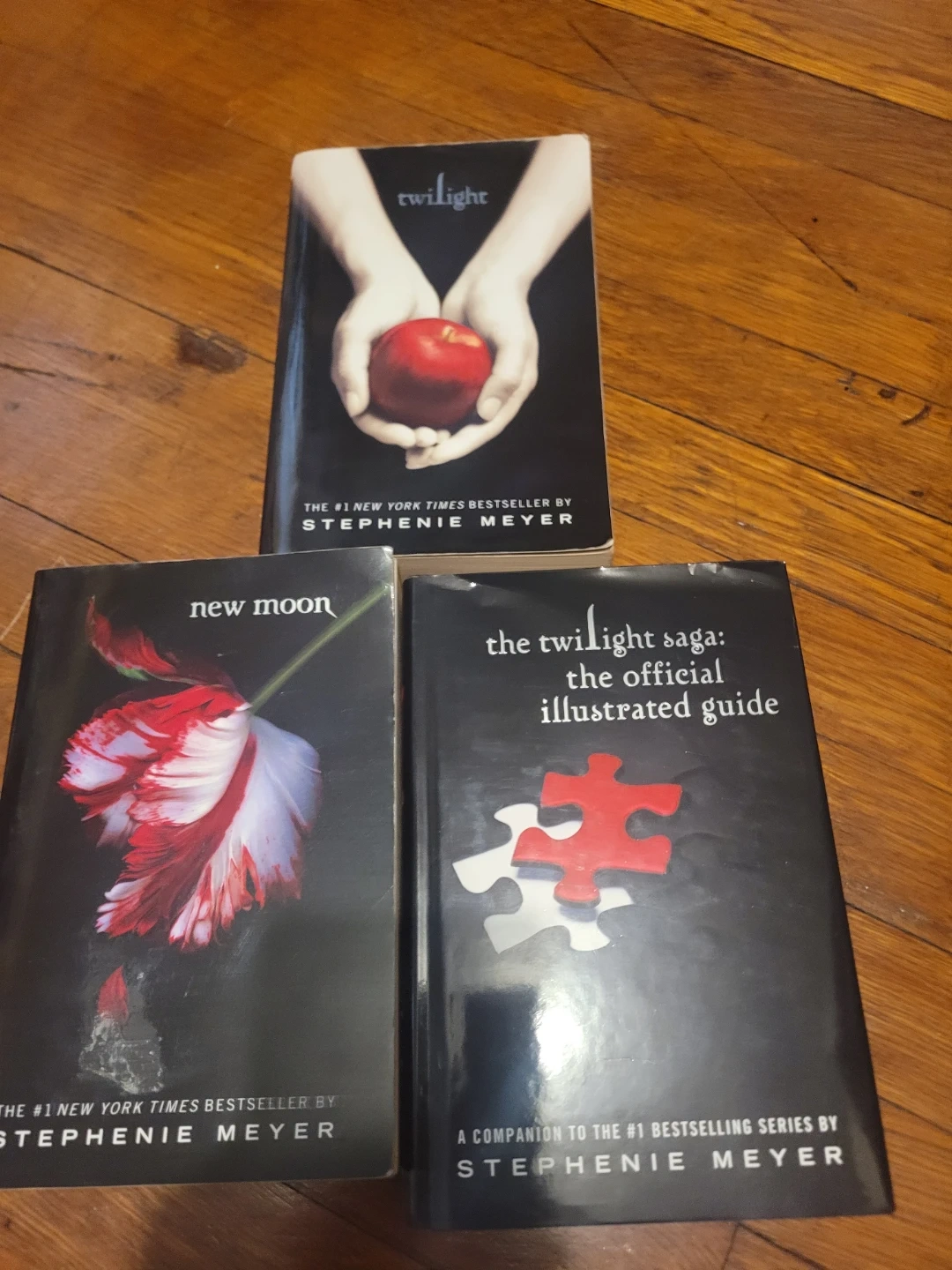 Collection of Twilight Saga books by Stephenie Meyer. Includes 'Twilight', 'New Moon', and 'The Twilight Saga: The Official Illustrated Guide'. These are paperback editions and New York Times bestsellers.