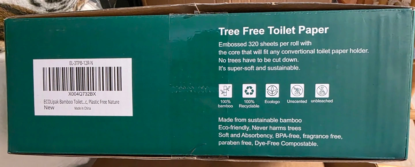 This is ECOLipak 3-ply bamboo toilet paper. It's soft, strong, and absorbent with no lint or fibers. Each roll has 320 sheets, totaling 3840 sheets across 12 rolls.