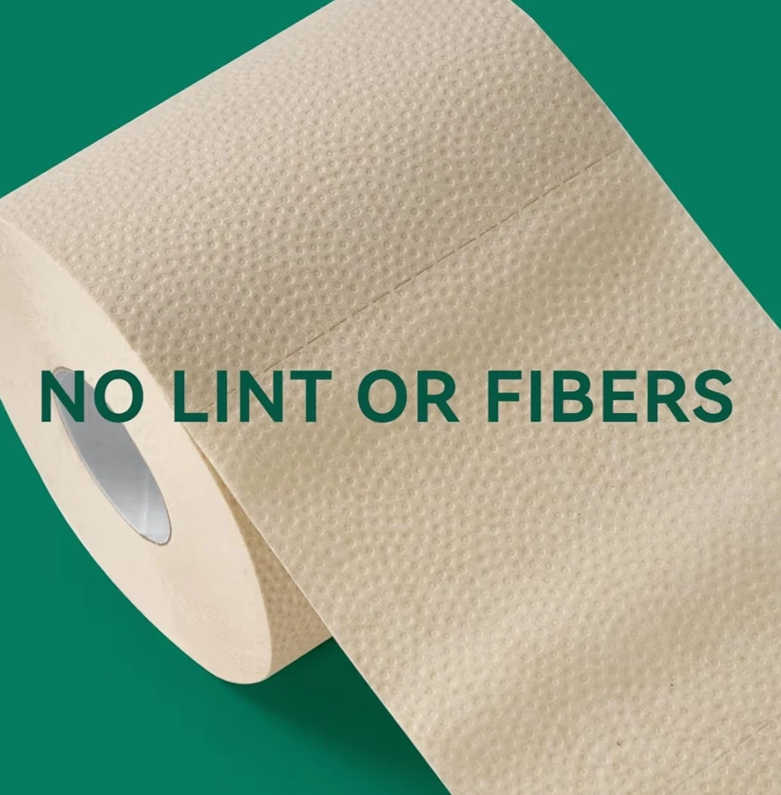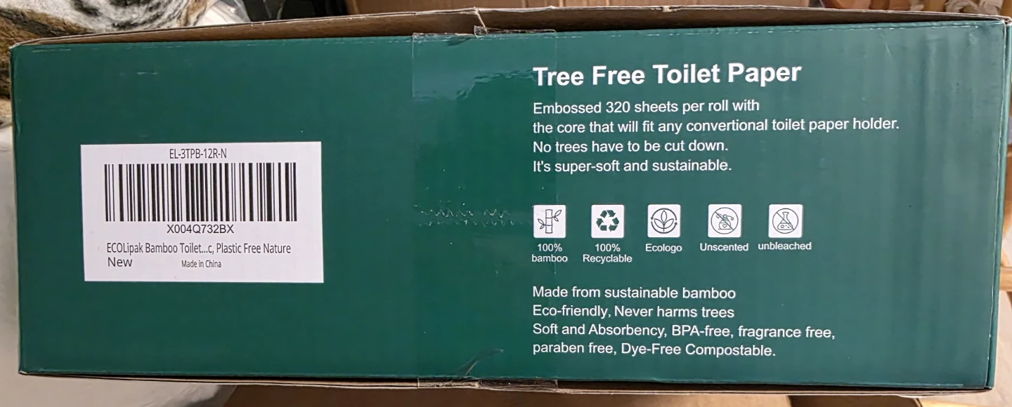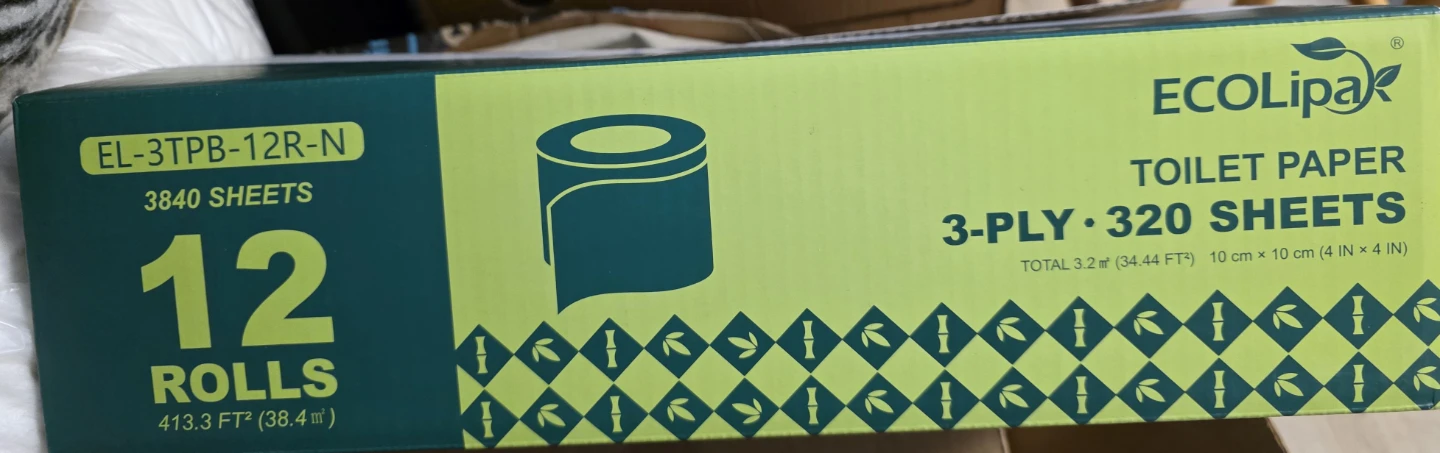 This is ECOLipak 3-ply bamboo toilet paper. It's soft, strong, and absorbent with no lint or fibers. Each roll has 320 sheets, totaling 3840 sheets across 12 rolls.