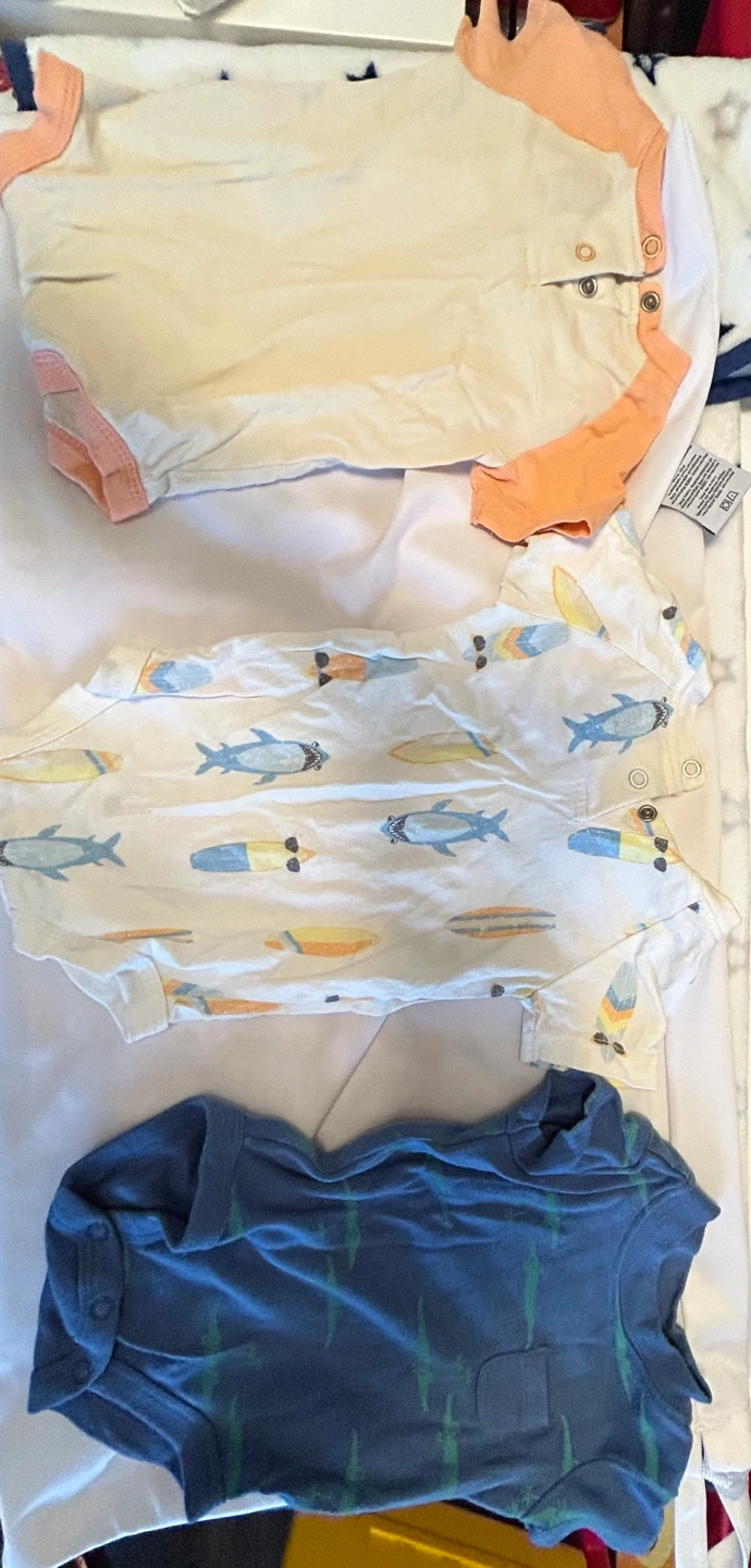 Three cute baby bodysuits. One features peach accents, another has sharks and surfboards, and the last shows crocodiles. Short sleeves and snap closures.