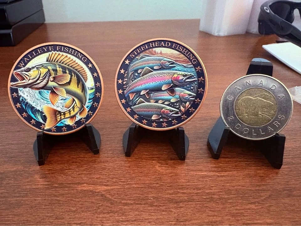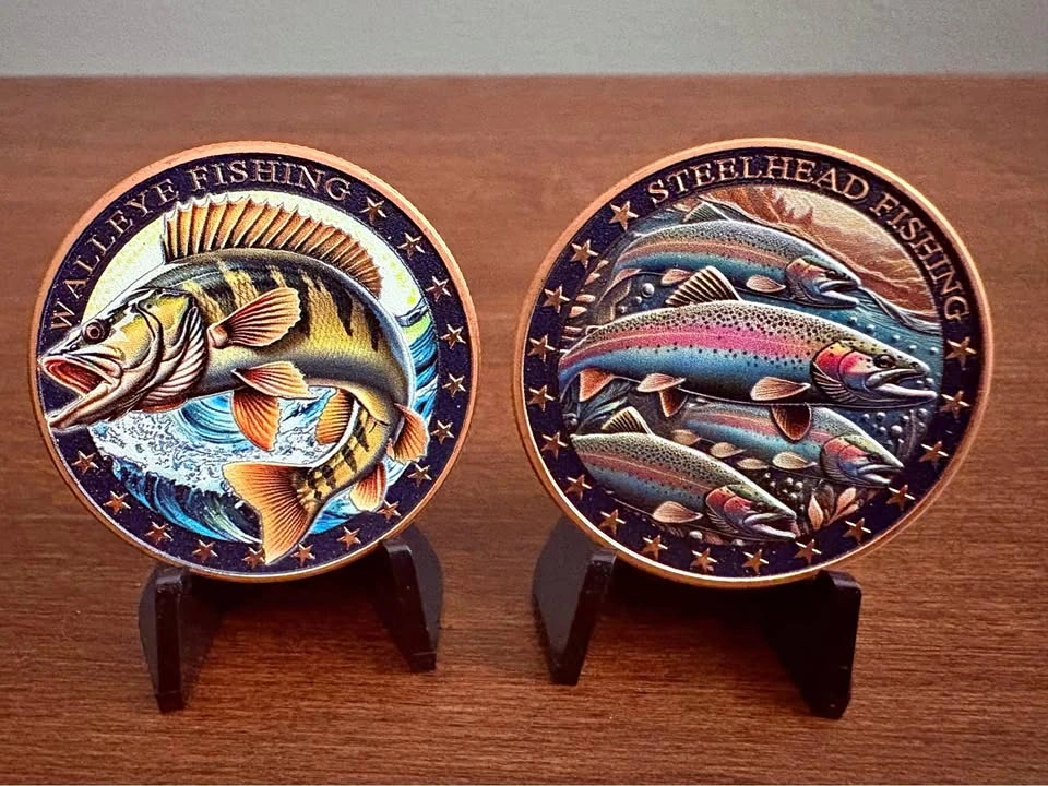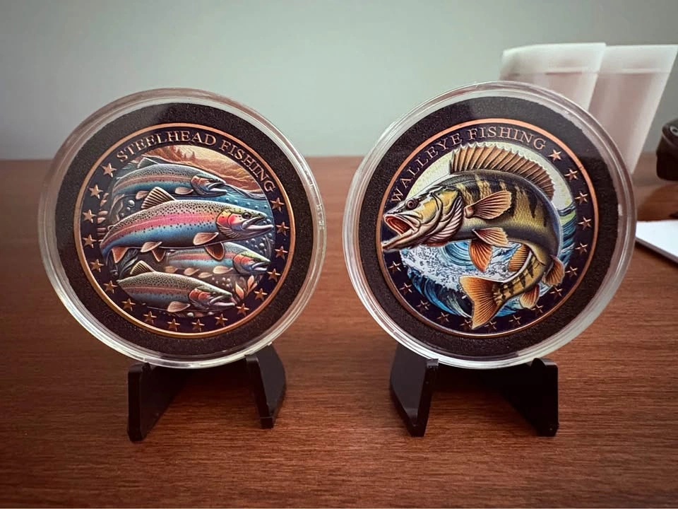 65Update - Bass also now available! See pic $12 ea or $30 for all three, multiple available. Brand new and fresh from the mint tube 1 oz .999 pure/fine copper Walleye, Steelhead, and Bass fishing rounds. Would make a nice gift, great prizes at fishing derbies, or a lucky charm for the tackle box. Optional extras: Add hard black gasket capsule +$3/ea Add display stand +$3/ea Can meet at public place in Maple Ridge. I'm happy to combine with my other listings, please search my name for other copper or silver coins & rounds. Follow me on marketplace to be notified first of new listings! Thanks for looking!