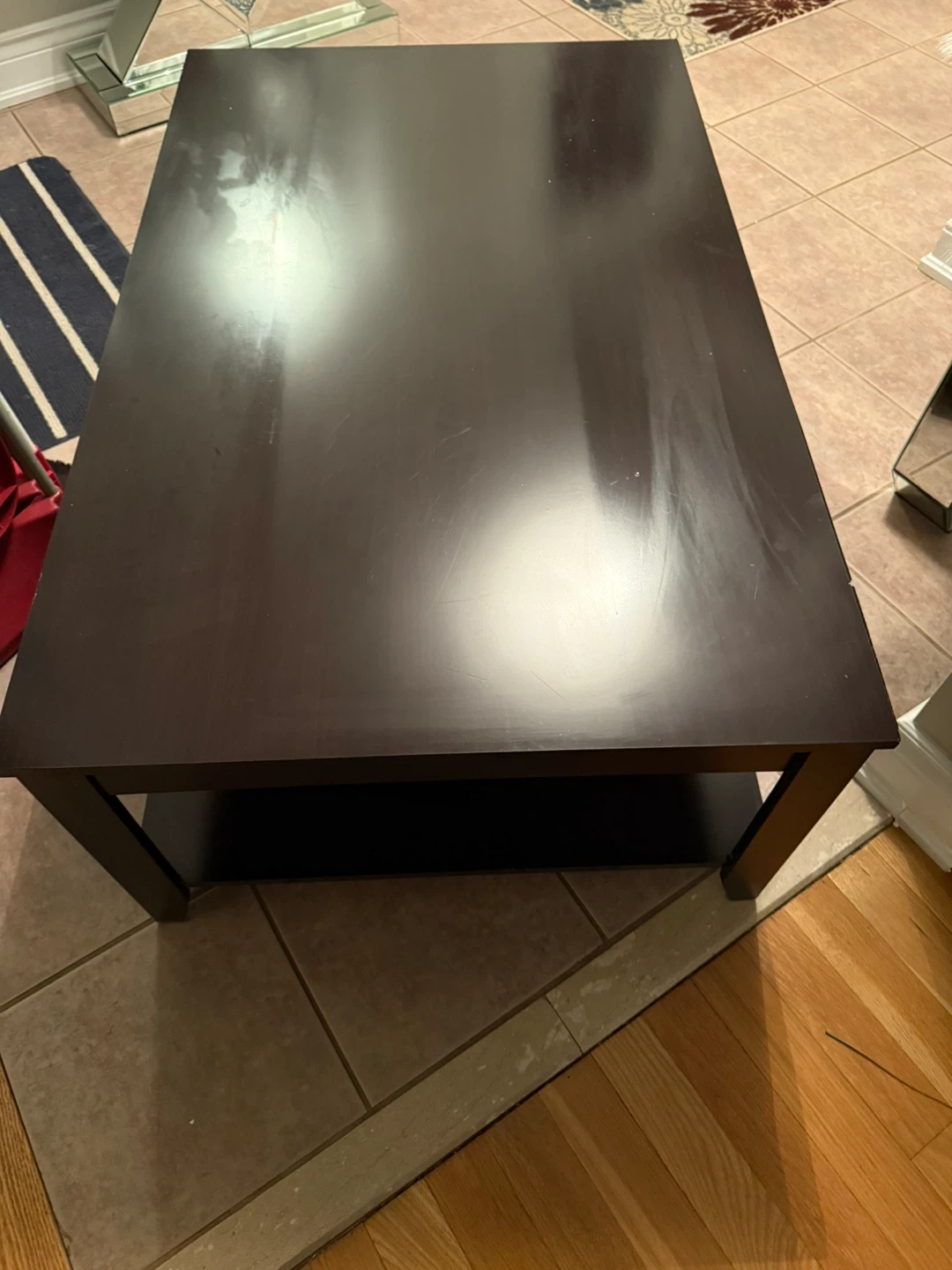 10Selling a set of dark brown wood coffee and end tables. They have a simple, modern design with a shelf underneath for storage. The tables are in okay condition and would be a great addition to any living room or family room Peeling In on side a bit, see photos