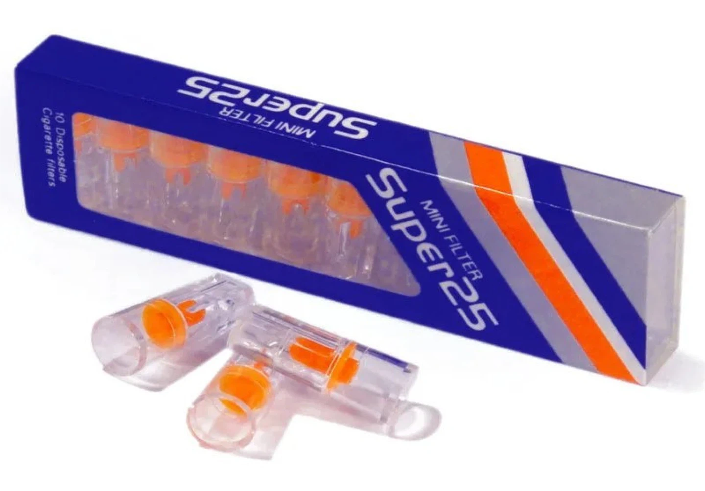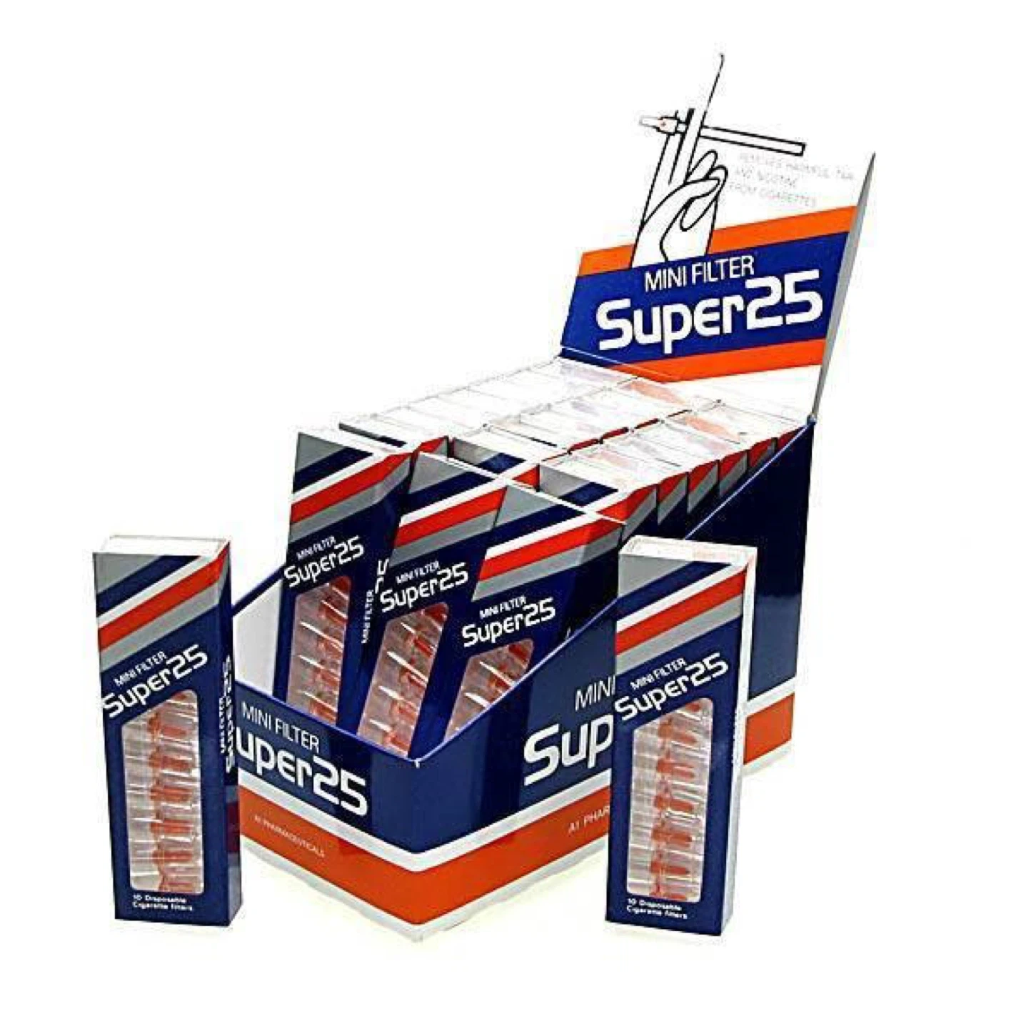 Super 25 Cigarette Mini Filters are designed to reduce the intake of tar and other harmful chemicals without altering the taste and flavor of the cigarette, providing smokers with a smoother and healthier smoking experience. The transparent body of the filter allows smokers to visually monitor the accumulation of tar as they smoke. Wrapped in cellophane and manufactured without chemical adhesives, Super 25 filters offer a cleaner and more hygienic choice for smokers. 1 pkt of 10 x 36 pkt box( sold by box)