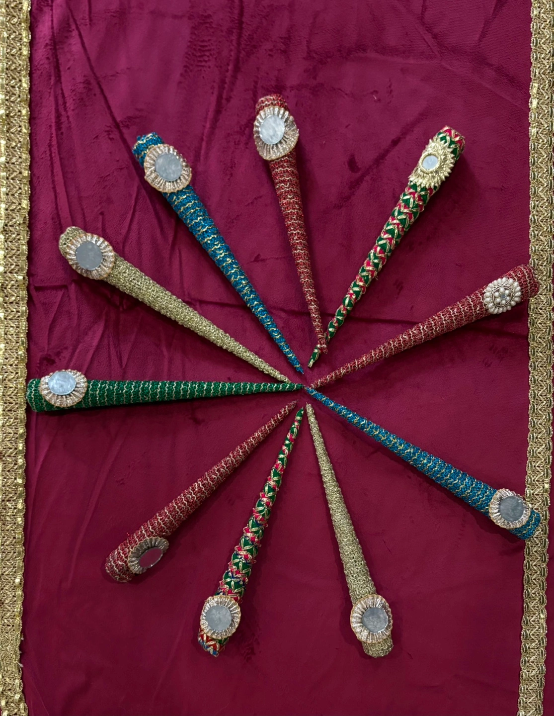 Ten beautifully decorated henna cone applicators. Perfect for applying henna for weddings or special occasions. Each cone features unique embellishments and a small mirror at the tip.