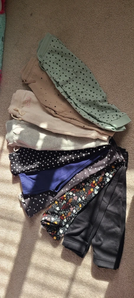 10A bundle of 10 girls' leggings and sweatpants in various colors and patterns! There's a mix of brands and styles, perfect for the current fall/winter wear. 4 are from Picapino - the 2 solid black ones and silver polka dots one were washed and never worn. Flower pattern was worn only a couple times. 1 Navy blue one is from Carter's and was worn only a few times. 2 beige and seafoam green ones are from H&M - washed and never worn. 2 Gap joggers were worn a few times but are in great condition. 1 flare black with hearts is from H&M only worn a couple times. They are all fleece lined are size 3T. They range from new to great condition and are ready for a new home. price is $60 for 10 - averaging $6 each and half of these are never worn.