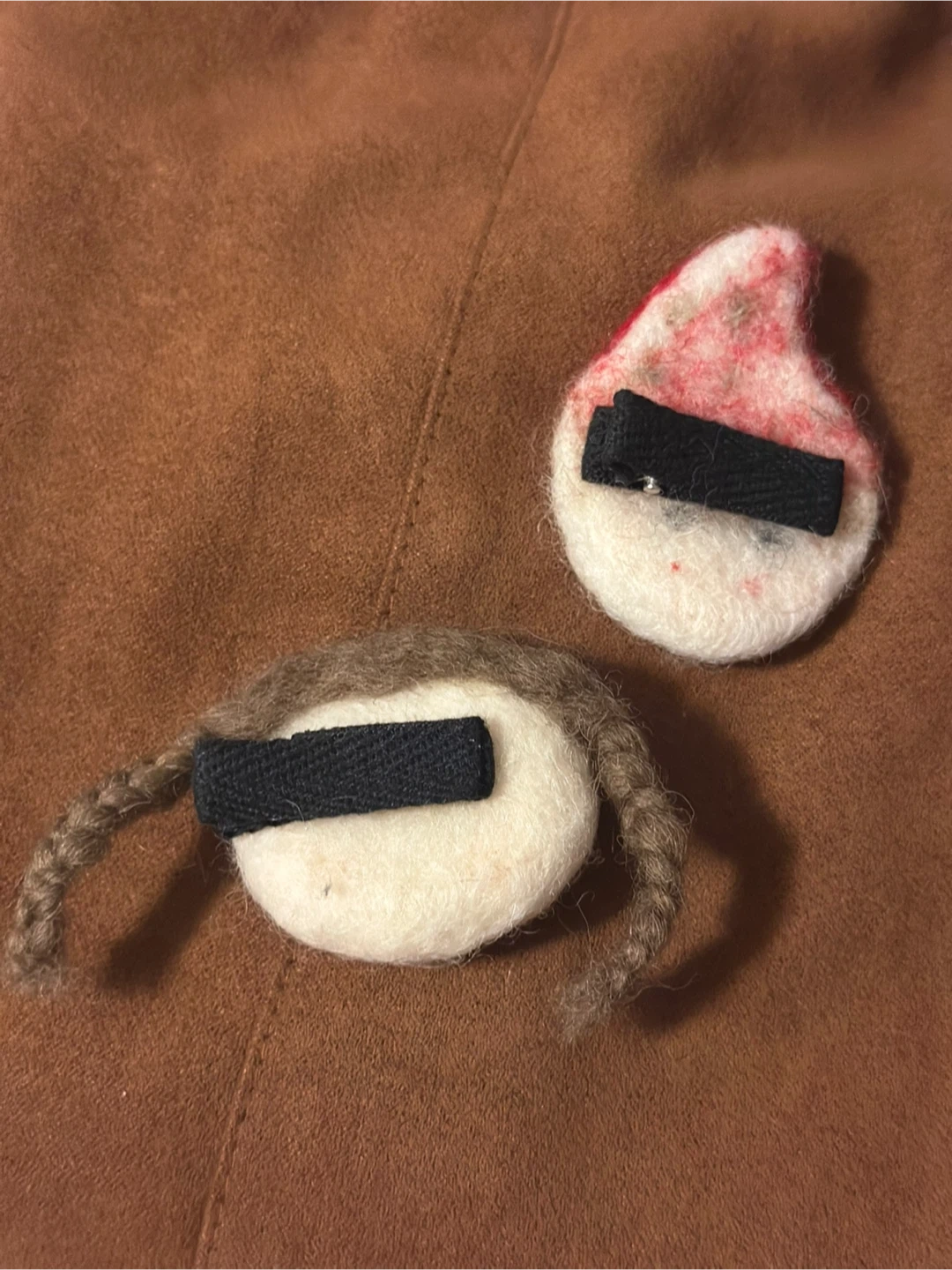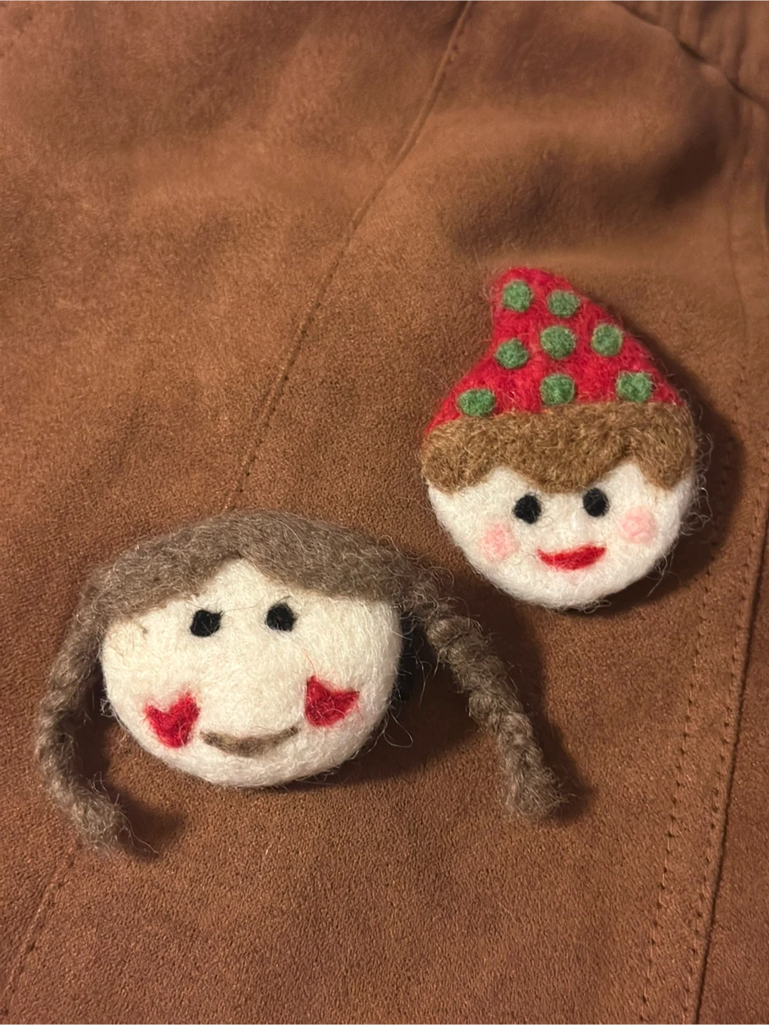 10These adorable handmade felt brooches are perfect for adding a touch of whimsy to your outfit! One is a cute girl with braids, and the other is a cheerful elf with a polka-dot hat. They're both in great condition and ready to find a new home on your jacket, bag, or wherever you like