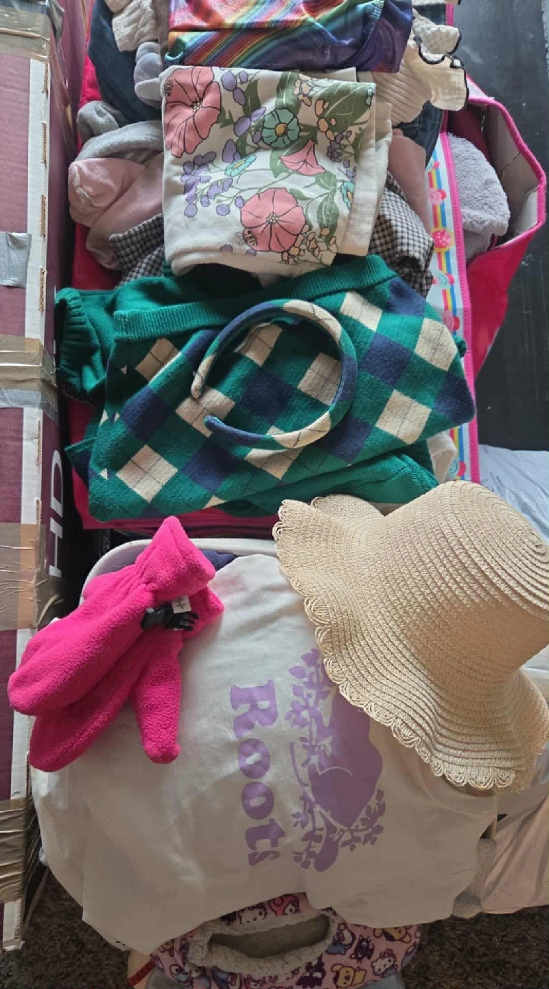60Allergy warning: we have a cat at home. Clothes are in good condition and for all seasons. Some are from famous brands. Slippers, tights, mittens and hats are also in this pile. There is colorful gymnastics leotard in the top of photo. Price range $2-5.
