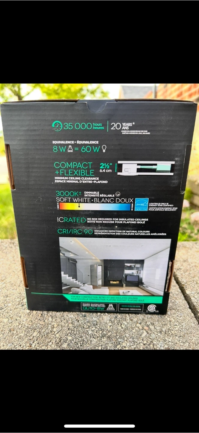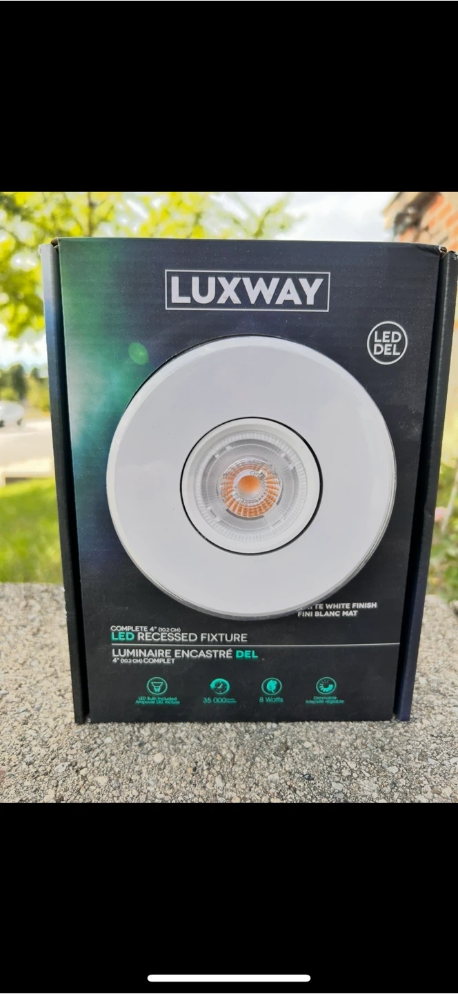 140NEW IN BOX I have 3 extra. $ 10 each Selling a brand new Luxway 4" LED Recessed Fixture still in its original box! This complete fixture features a white finish and is designed for easy installation. It's energy-efficient, using only 8 watts while providing the equivalent of 60 watts of light. Perfect for new construction, retro-fit, and insulated ceilings. It's also dimmable and rated for 35,000 hours!