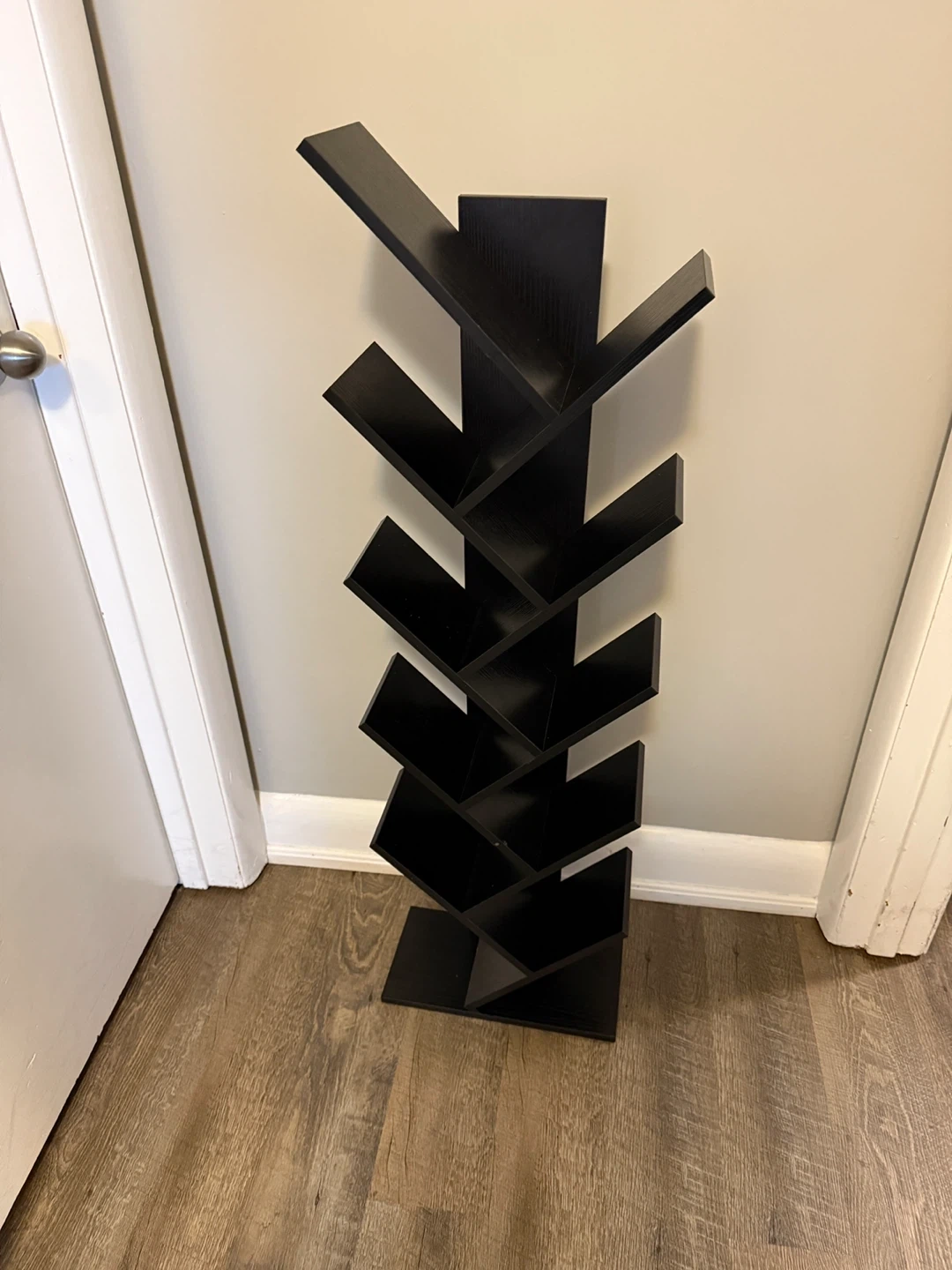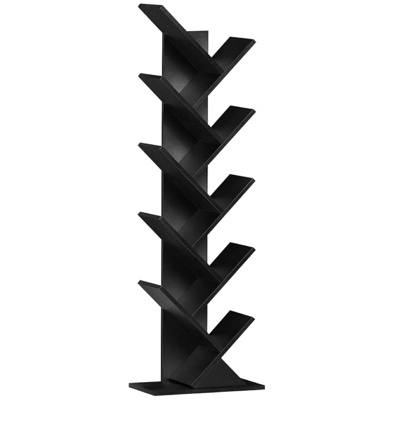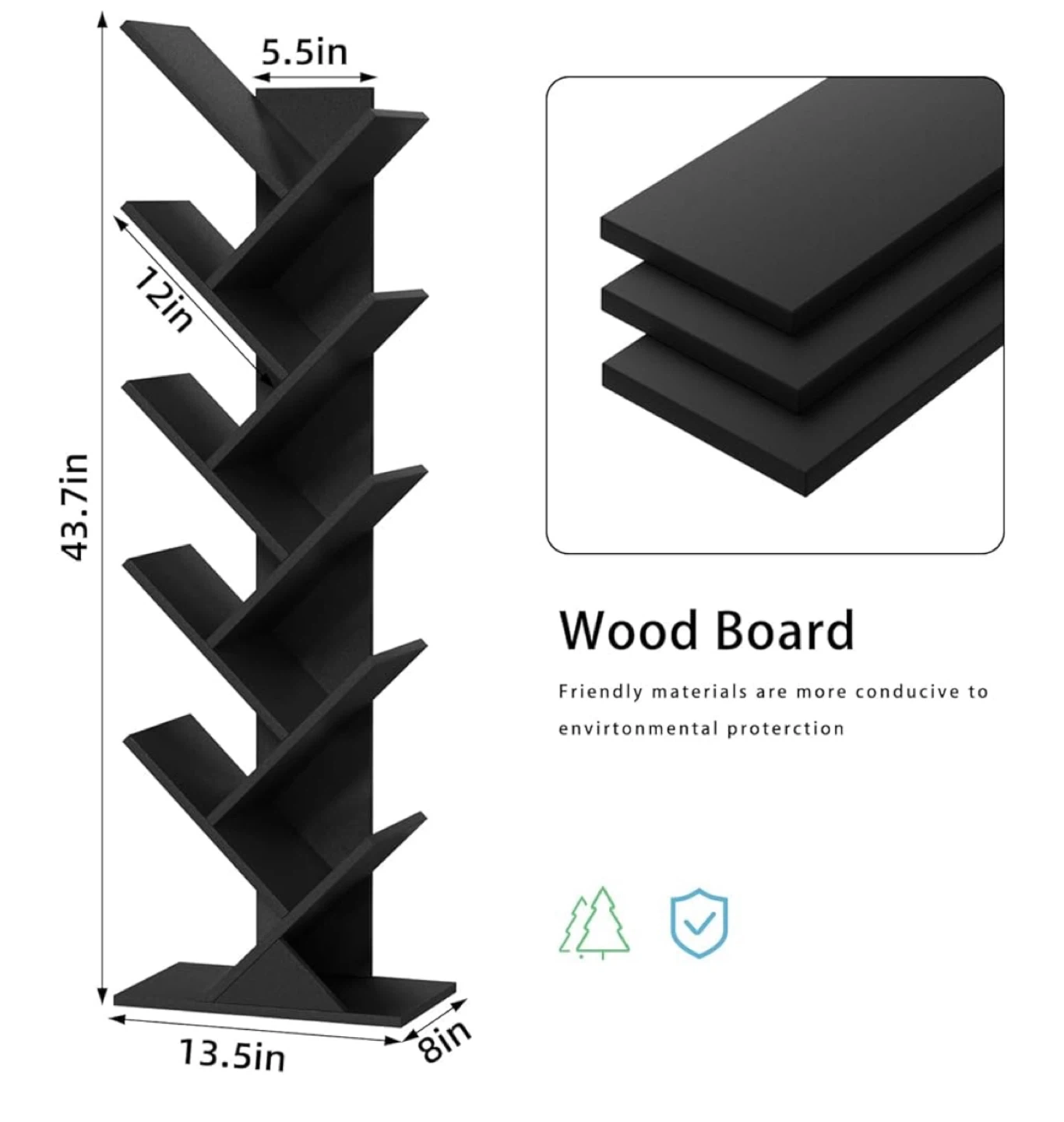 95Here's a cool 10-tier tree bookshelf in mysterious black. It's perfect for displaying your favourite books or adding a unique touch to your space. Key Specifications: - Dimensions: 43.7 inches (height) x 13.5 inches (width) x 8 inches (depth) - Shelf thickness: 5.5 inches - Shelf height: 12 inches - Material: Wood Board