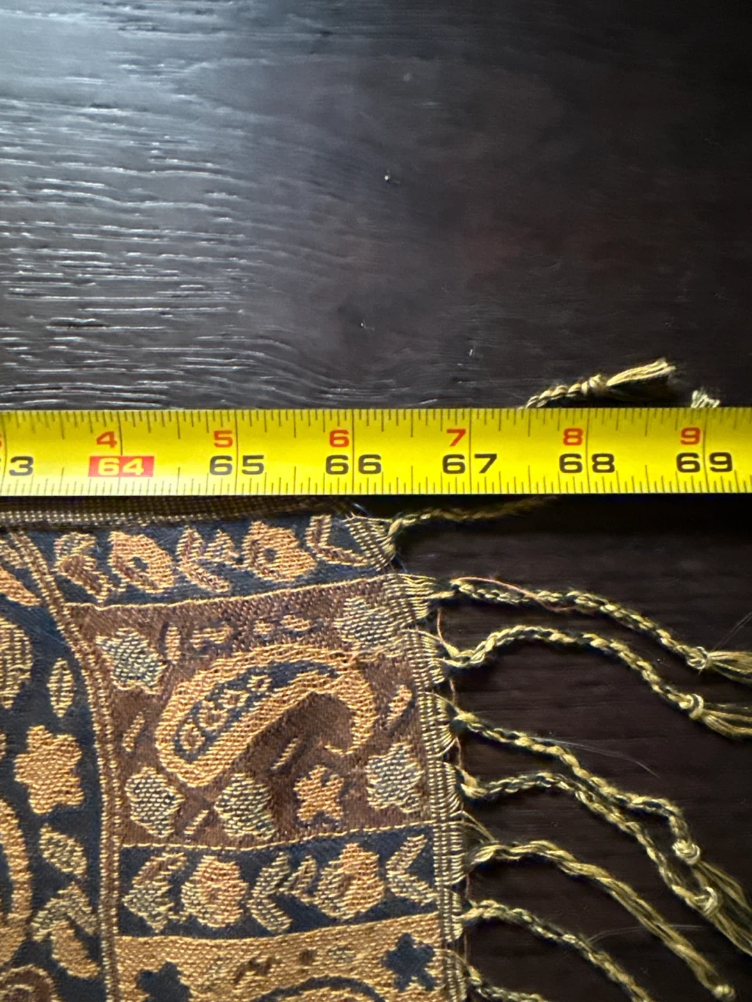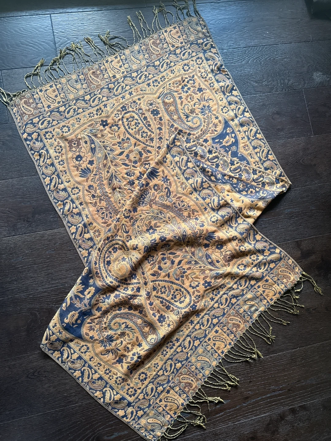 55Beautiful cashmere scarf / shawl featuring a paisley and floral design. It measures approximately 66 inches in length. The material is 100% cashmere. Gold and brown tones. Fringed braided edging. Made in Jerusalem.