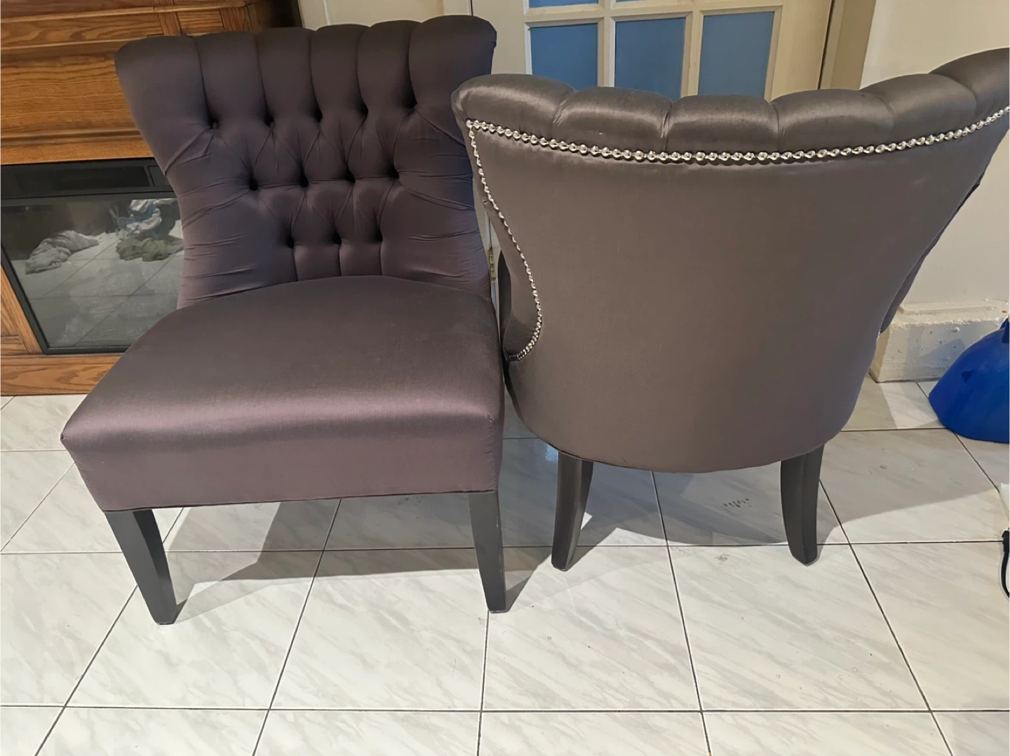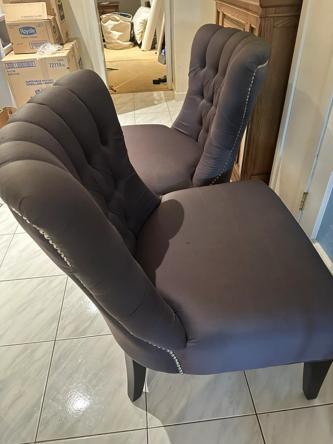 111Selling a stylish upholstered dining chair in a dark grey colour. It features a button-tufted back and a comfortable seat. Perfect for adding a touch of elegance to your dining space or any room in your home! Pet free smoke free home, small tear not that noticeable.