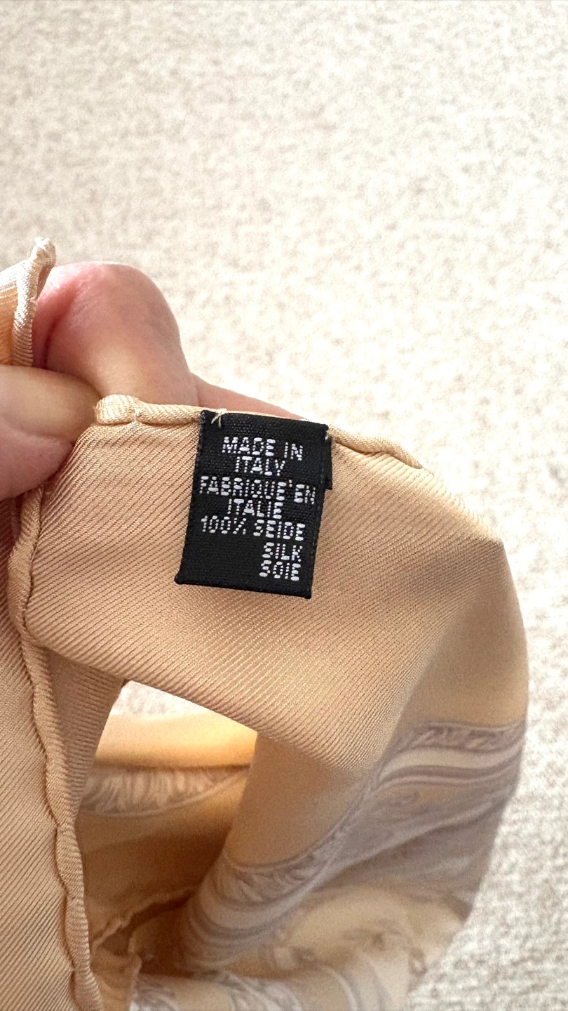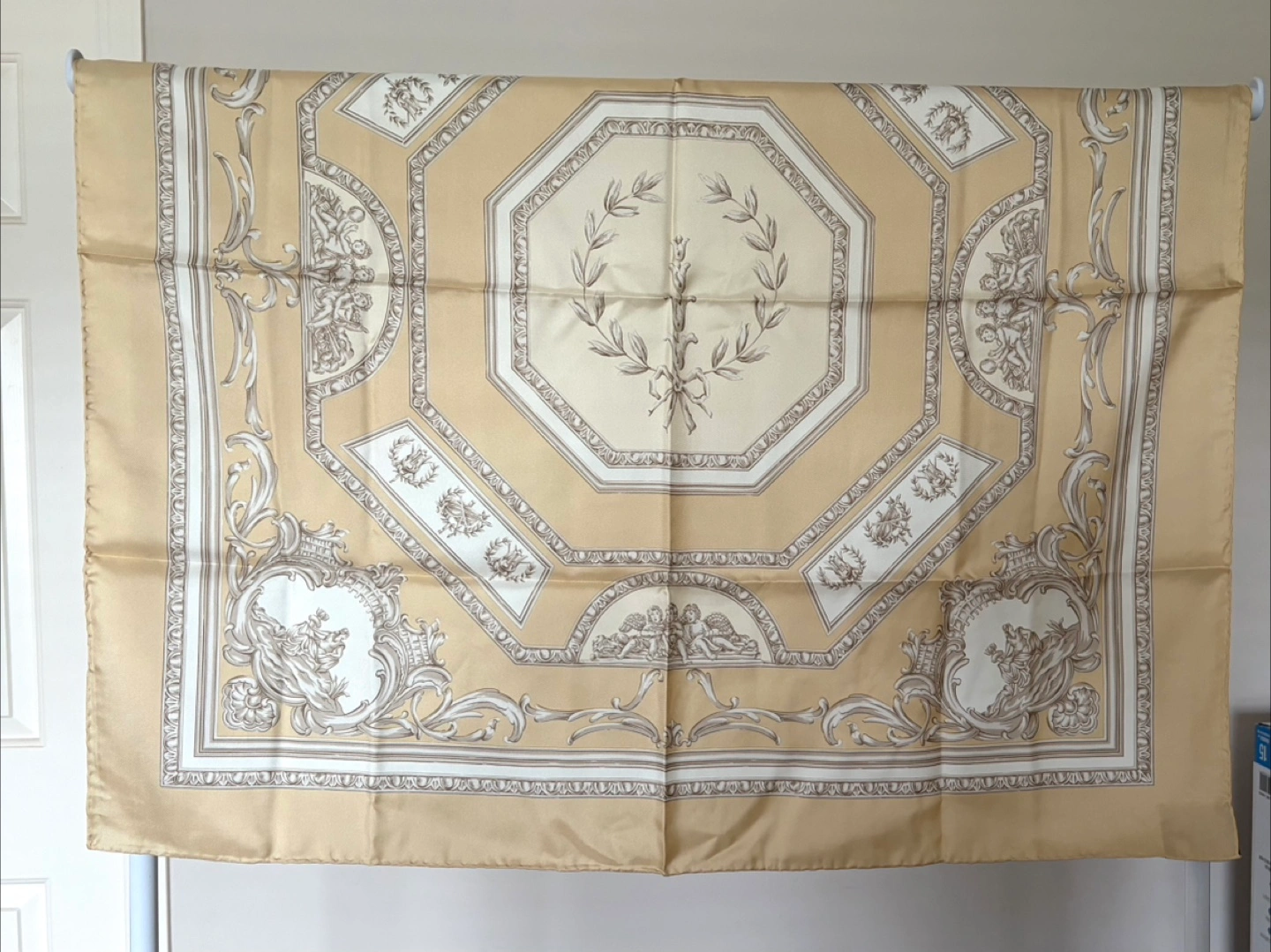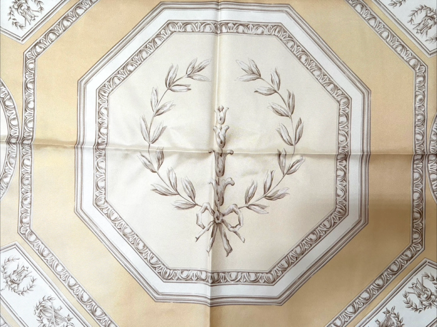 50Beautiful silk scarf featuring an elegant design with angelic figures and laurel wreaths. The scarf is made of 100% silk and has a luxurious feel. Perfect for adding a touch of sophistication to any outfit! 34” x 34”
