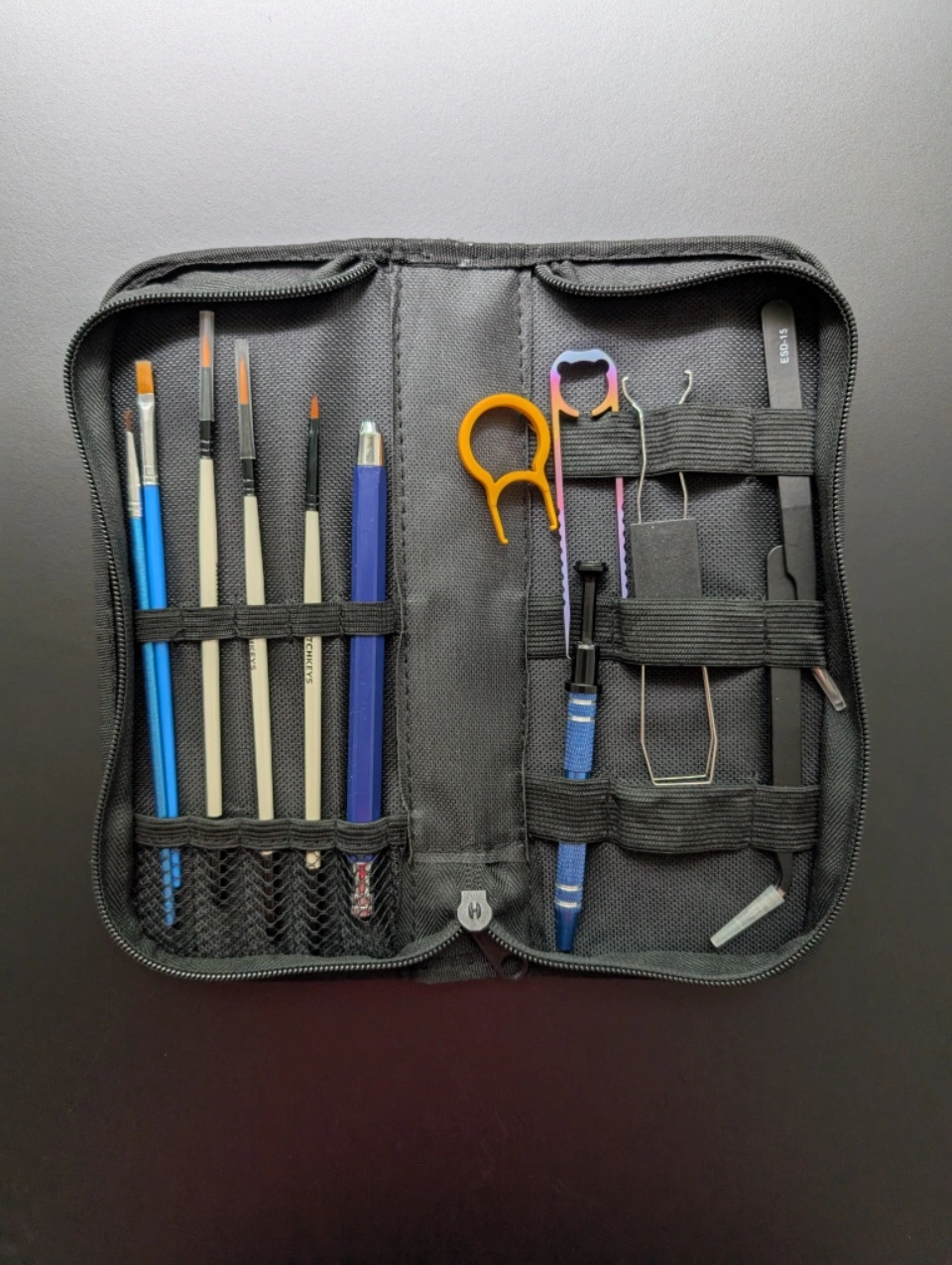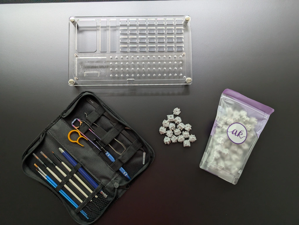 Comes with a variety of tools. A great way to find a satisfying hobby. Included are brushes, tweezers, lube station and 100 Zaku Linear Switches. Switches are new and untouched. Zaku Switches are hard to find.