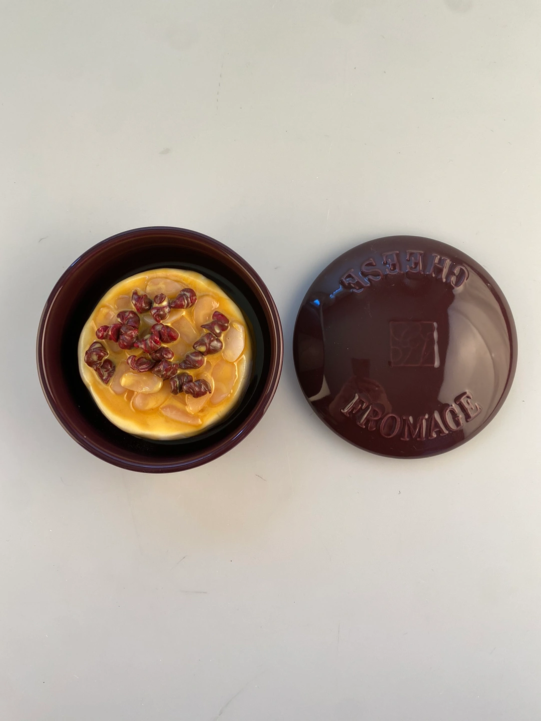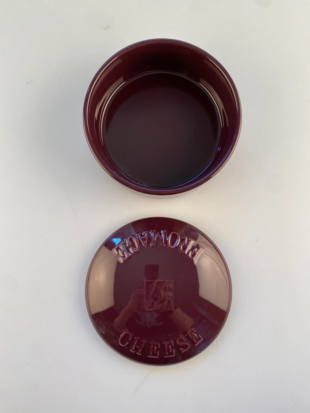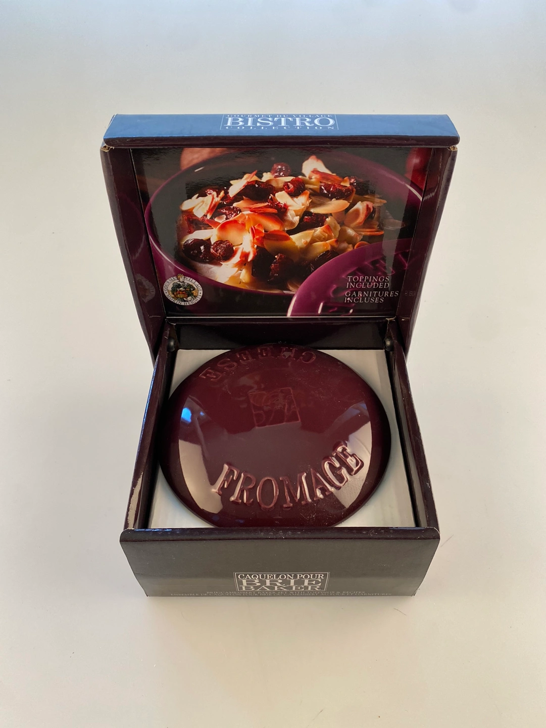 f you haven’t had an ooey gooey piece of baked Brie before than you’ll have to trust me, you’re missing out! This Purple Brie Baker from the Gourmet Village Bistro Collection is perfect for baking a brie in the oven or in a toaster oven. Cover after baking with the cheese / fromage imprinted lid to keep your cheese perfectly warmed. I tossed the 10+ year old seasoning mix. The Brie in the photo is fake food. New in Box. Dishwasher, Microwave & Oven Safe.. The 5” x 2” x 5” small purple dish can be used for pretty much anything hot or cold.