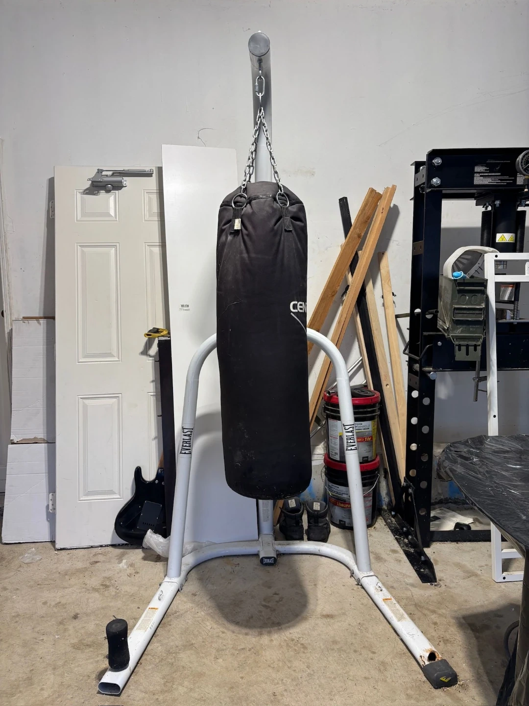 192This is an 100lb Everlast punching bag with stand, perfect for home workouts and boxing training. The unit is used, with some cosmetic wear and tear on the stand. It is still fully functional and ready to use. The heavy bag is durable and provides a great striking surface for all skill levels, from beginners to advanced fighters. * Durable construction * Suitable for various training routines