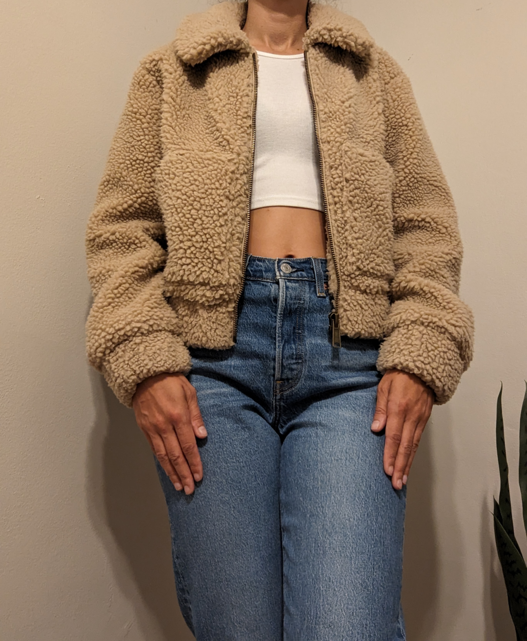 Buy & SellSherpa JacketSherpa Jacket$30Dress in style this fall with this cozy Sherpa Jacket from Garage. Size S/XS.ConditionLike newWHERE TO MEETCheck LocationView MapSELLERBethYonge Eglinton34230 reviews0 chats·0 favorites·64 views